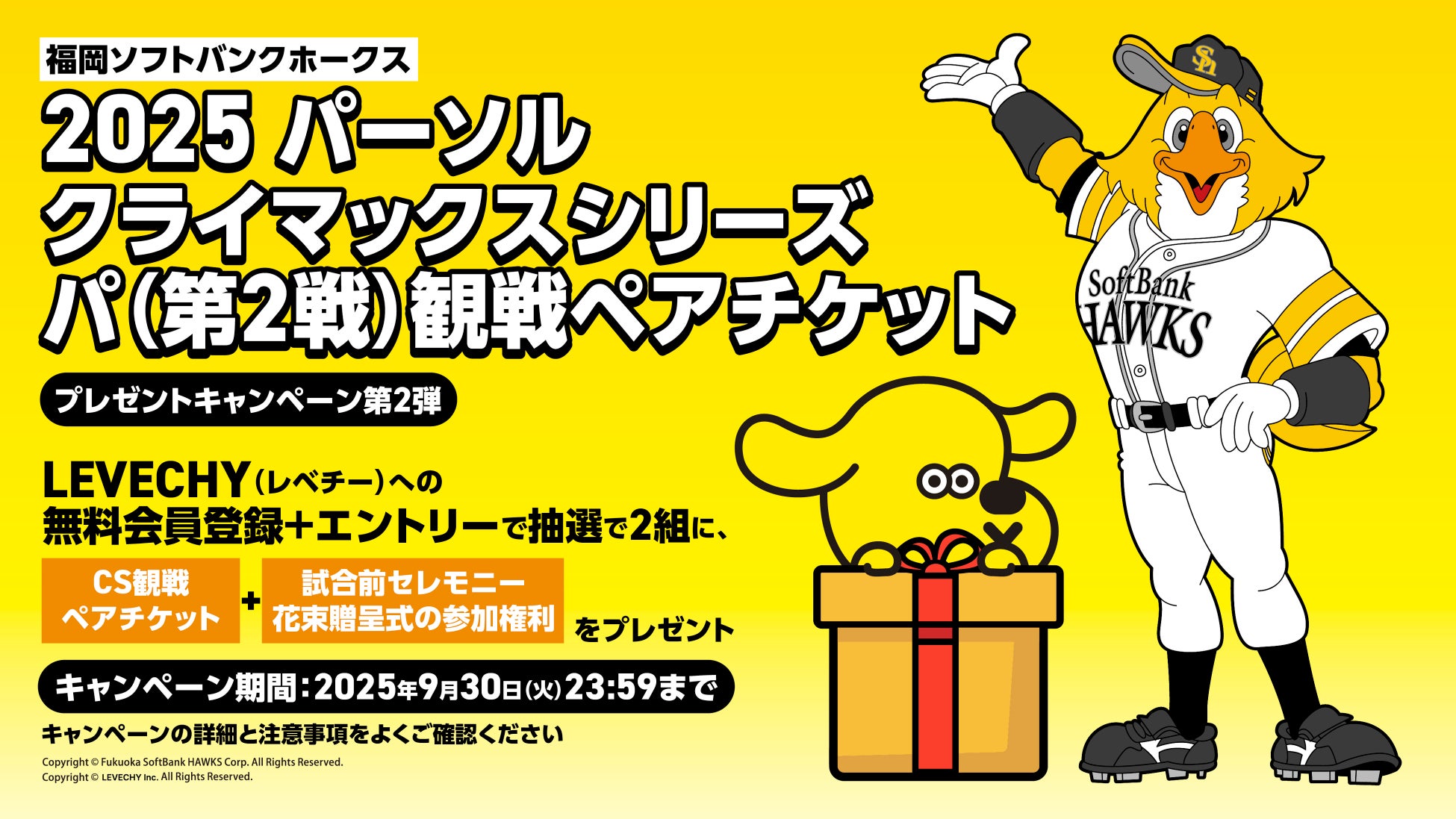 株式会社LEVECHY(以下、「当社」といいます。)が主催する「【LEVECHY】 福岡ソフトバンクホークス「パーソル クライマックス パ」観戦ペアチケットプレゼントキャンペーン」(以下、「本キャンペーン」といいます。)には以下のキャンペーン規約が適用(以下、「本規約」といいます。)されます。