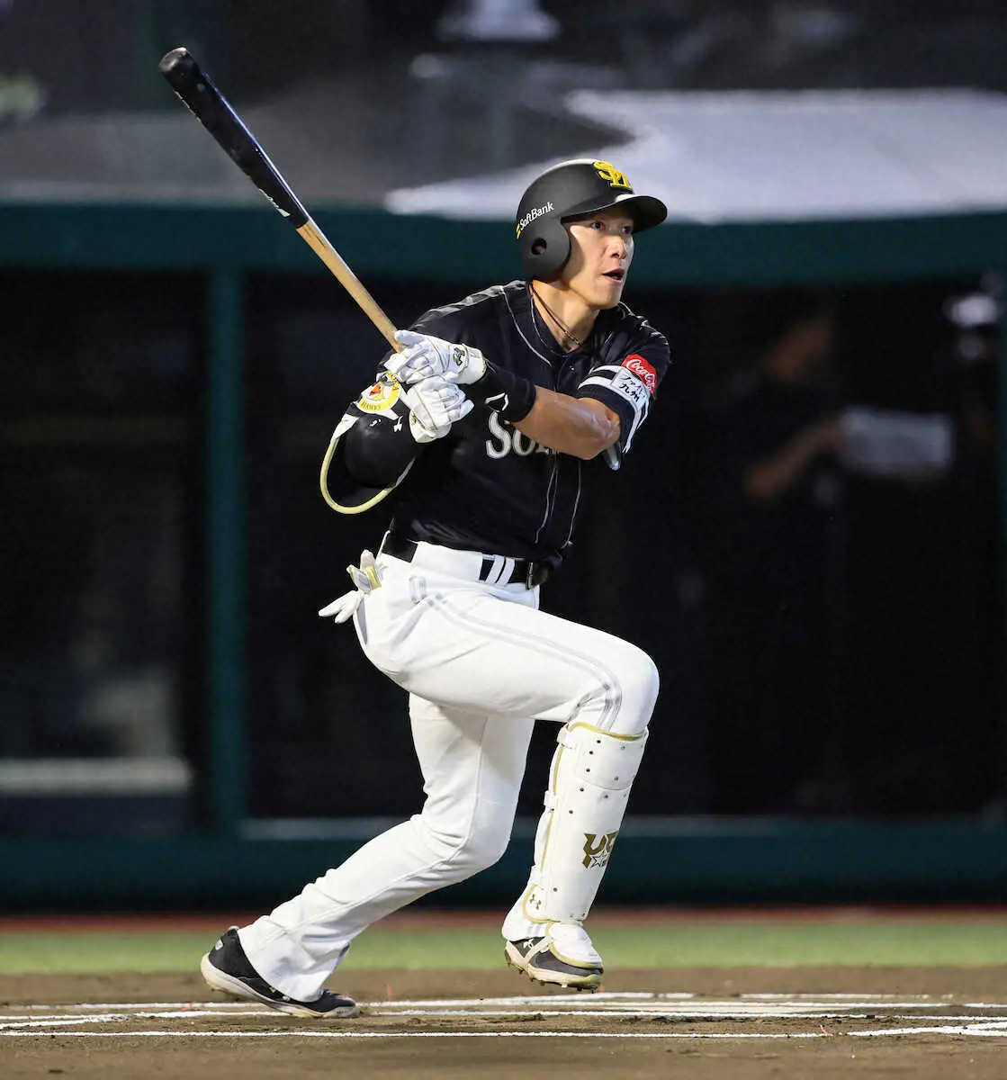 <楽・ソ>初回、二塁打を放つ柳田(撮影・尾崎 有希)