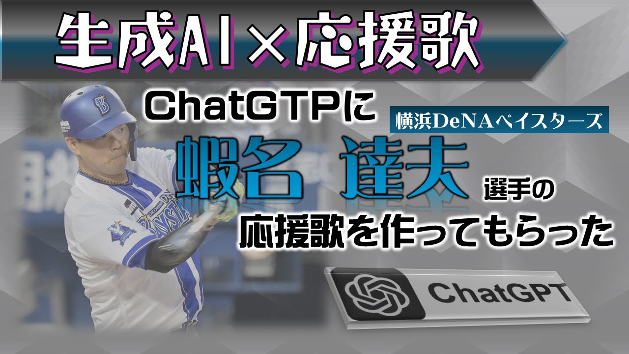 ChatGTPに蝦名達夫選手の応援歌を作ってもらった 応援歌の作成に生成AI(ChatGTP)を用いたらどうなるか…興味本位でやってみました。 作曲に特化したAIのほうが、よりクオリティの高い曲が出来上がるかもしれません。 Chat GTPYOKOHAMA DeNA BAYSTARS応援歌横浜DeNAベイスターズ蝦名達夫 NPBHUB.COM | The Fanbase of Nippon Baseball & Nippon Professional Baseball