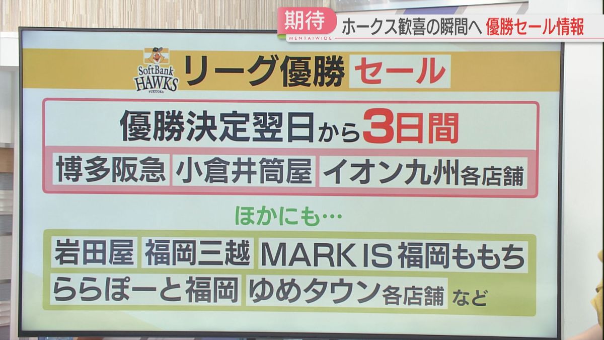 博多阪急や小倉井筒屋、イオン九州の各店舗では、リーグ優勝決定の翌日から3日間、セールを実施します。ほかにも、岩田屋や福岡三越、MARK IS 福岡ももち、ららぽーと福岡、ゆめタウンの各店舗などで実施される予定です。
