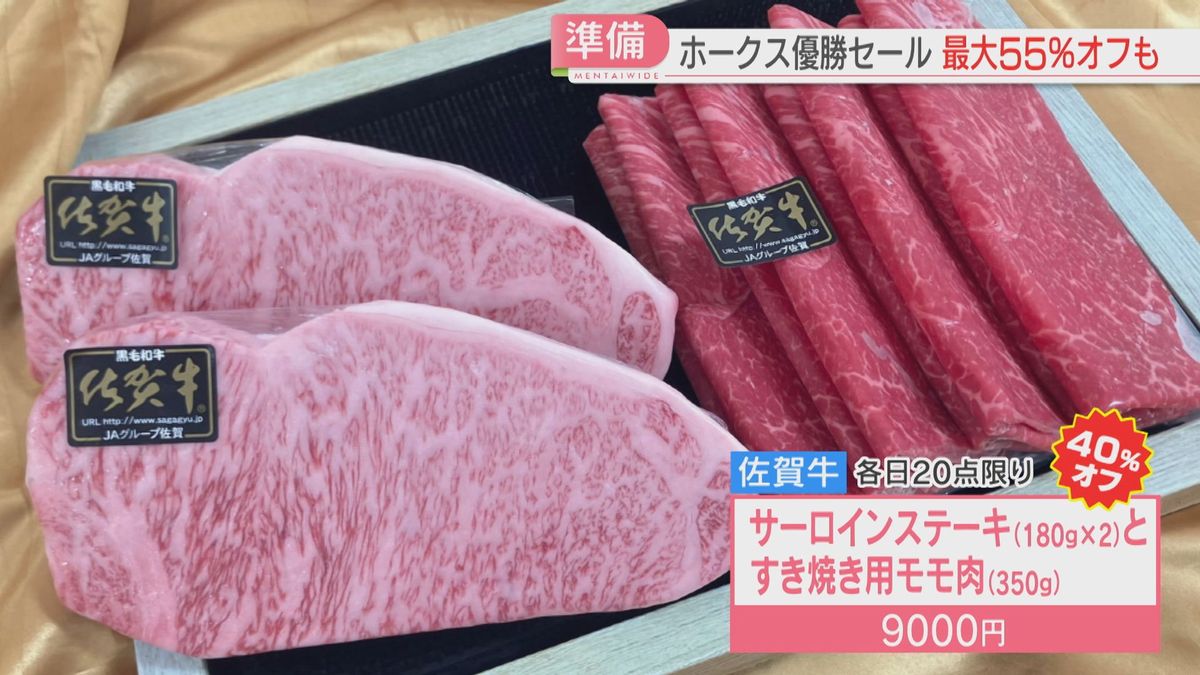 甘みとコクのある脂身が特徴の佐賀牛は、サーロインステーキとすき焼き用の肉がセットで通常価格からおよそ40パーセントオフの9000円です。