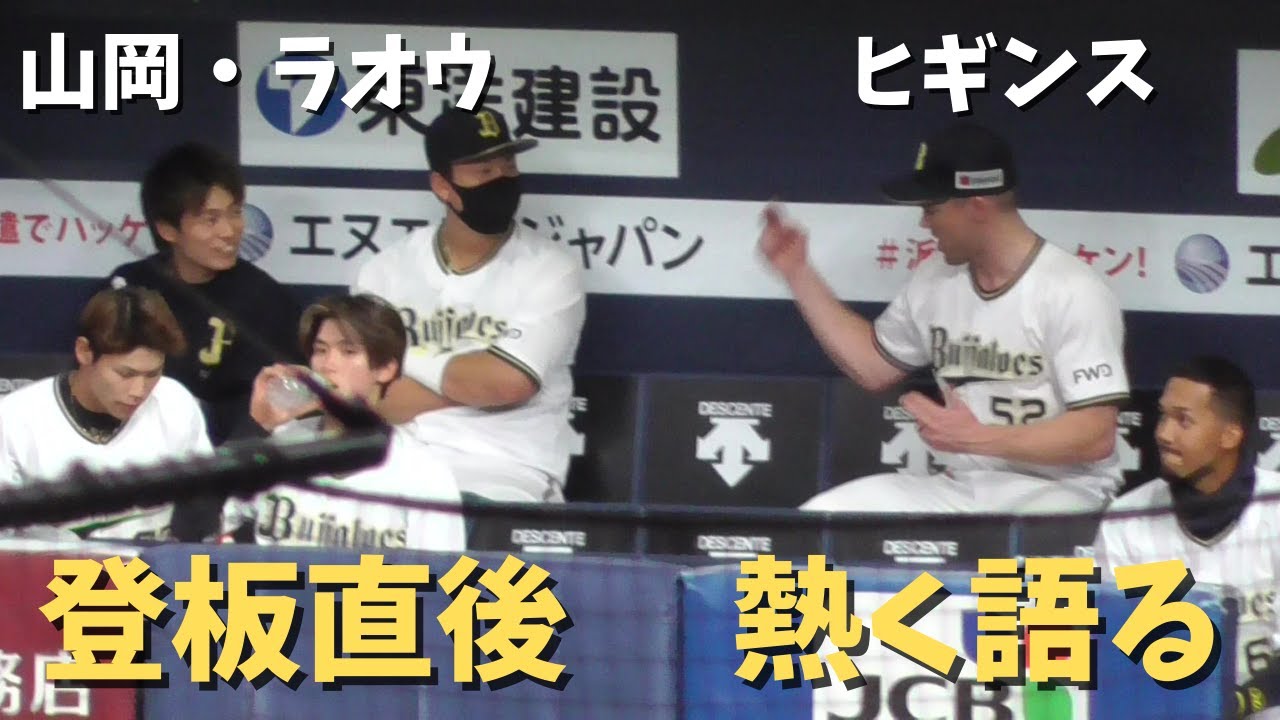 2021年4月16日のロッテ戦、9回表を三者凡退(11球)で抑えたヒギンスがベンチに戻るや否や、山岡に熱く語りかけていました。