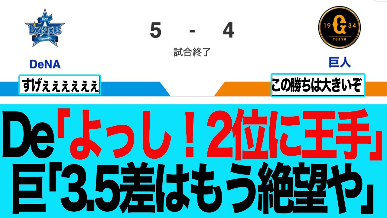 今回の動画はDe「よっし!2位に王手」巨人「3.5差はもう絶望や」とベイスターズファンの反応をまとめた動画内容になります。