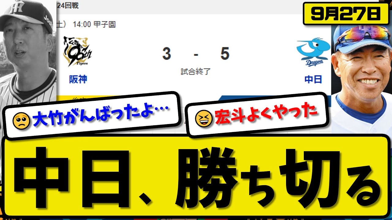 【セ1位vs4位】中日ドラゴンズが阪神タイガースに5-3で勝利…9月27日勝ち切る…先発髙橋6.2回2失点…ボスラー&細川&山本が活躍【最新・反応集・なんJ・2ch】プロ野球