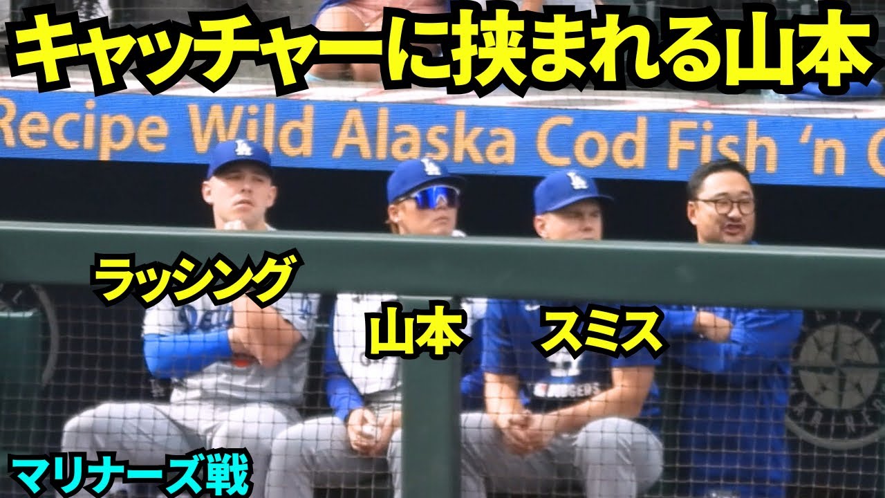 キャッチャーに挟まれて応援する山本由伸!【現地映像】2025年9月28日マリナーズ戦