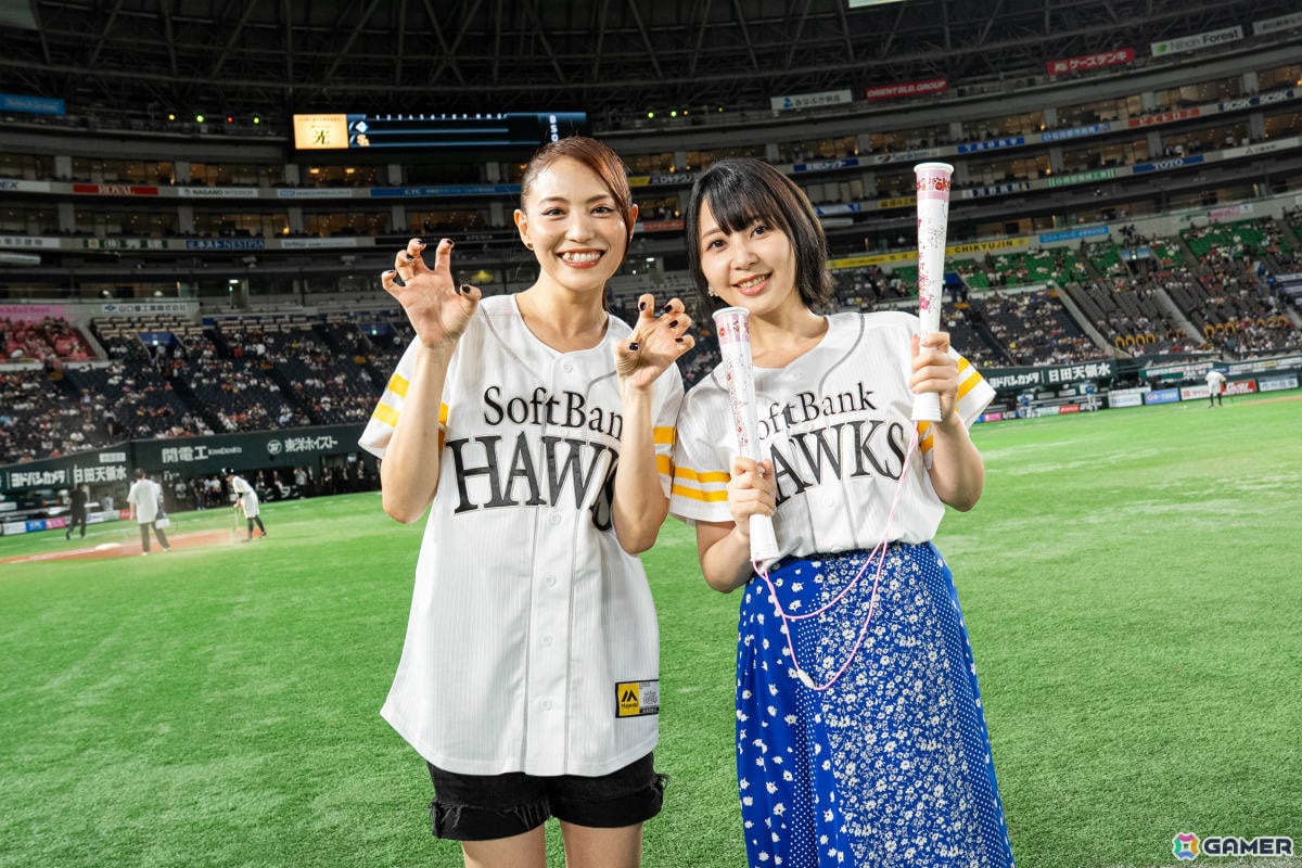 PRタイムで種田は作品の魅力について、「劇場版になってさらにパワーアップしてみなさんのもとにお届けすることができます!笑いあり、涙あり、そしてライブ映像ありの盛りだくさんの映画となっております!」と熱く語りました。田野は始球式の意気込みについて聞かれると、「ホークスの勝利、そして映画の大ヒットを込めまして投げさせていただきます!佐賀へ届けー!」とやる気がみなぎる様子でコメント。そして、マウントに入った田野は、キャッチャーの後ろで応援する種田が見守る中、大きく振りかぶり見事なピッチングを披露!投げ終わった後は両手を挙げながら、キャッチャーまで笑顔で走り抜けました。スタジアムからの喝采を浴び、まさに九州から全国制覇の先駆けとなる大舞台となりました。