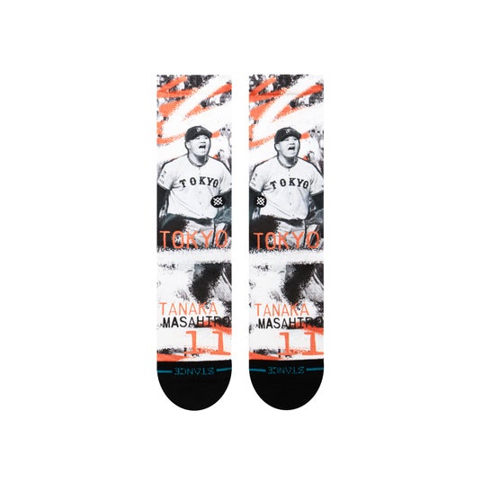 MTXIX MASAHIRO TANAKA読売ジャイアンツの田中将大投手が達成した日米通算200勝を記念した、特別デザインの記念ソックス。日常で使えるカジュアル仕様で、伸縮性のあるリブがふくらはぎを包み込み、きつ過ぎずゆるくない極上のフィット感を生み出します。デザインだけでなく、細部にまでこだわったスタンスらしい快適な履き心地に仕上げました。
