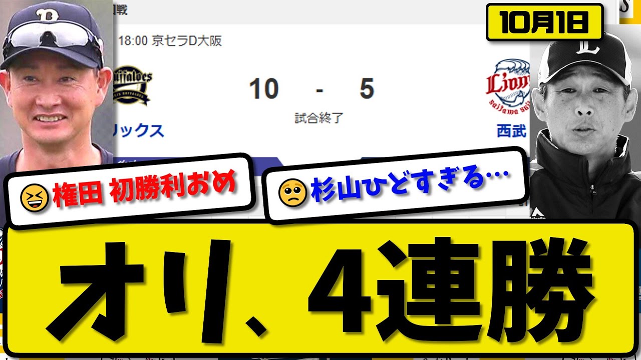【パ3位vs5位】オリックスバファローズが西武ライオンズに10-5で勝利…10月1日4連勝…先発エスピノーザ1.0回無失点…紅林&若月&杉本&西野&太田&頓宮が活躍【最新・反応集・なんJ】プロ野球