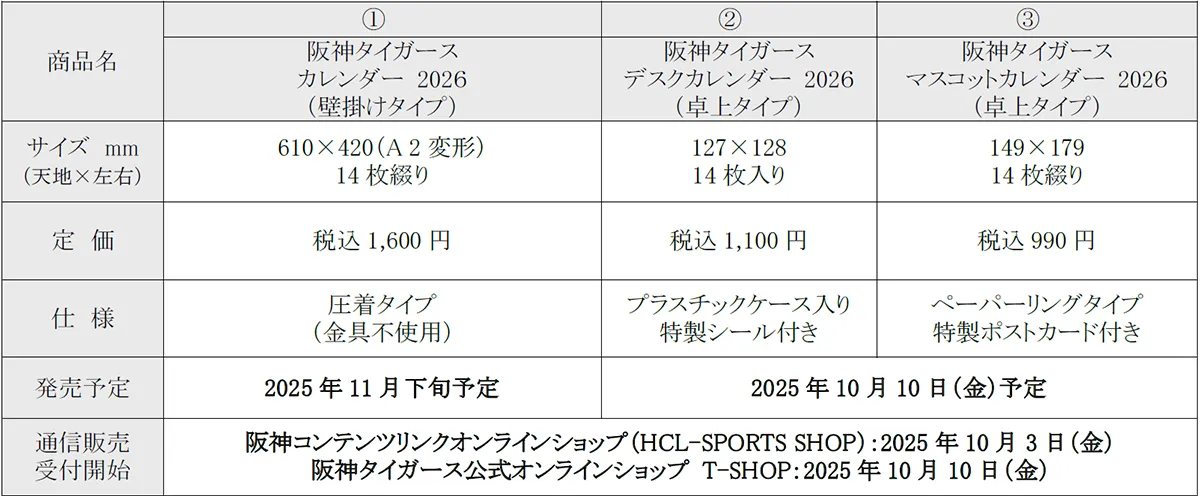 毎年、阪神タイガースファンの皆様にご好評いただいております「阪神タイガース カレンダー 2026年版3種類、(1)壁掛けタイプ・(2)卓上タイプ・(3)卓上タイプマスコット」について、10月3日(金)から阪神コンテンツリンクオンラインショップ(HCL-SPORTS SHOP)( http://www.hcl-sportsshop.com/ )で通信販売の先行受付を開始します。
