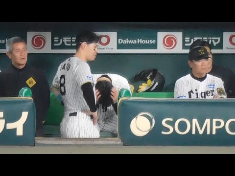 【悔しい…】あわやホームランも惜しくもファール 凡退後 頭を抱えて落ち込む森下を励ます佐藤輝明