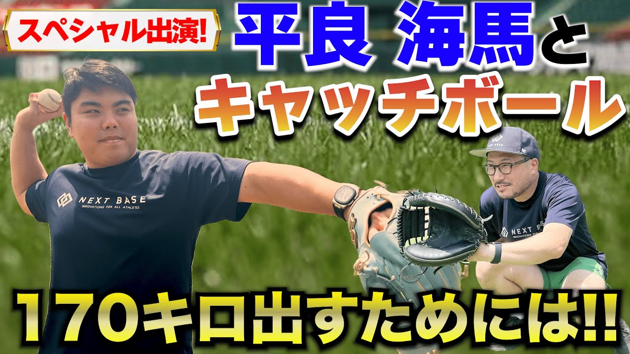 平良投手のYouTubeチャンネルにおけるピッチング動作についての対談後、コラボ企画としてグラウンドでキャッチボールをしながら、「今シーズンの目標」そして「球速170キロを目指すために必要なこと」について語られる。