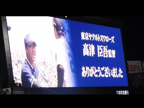 【ありがとう】今季で退任する高津監督に花束を贈呈する藤川監督 場内高津コールが沸き起こる
