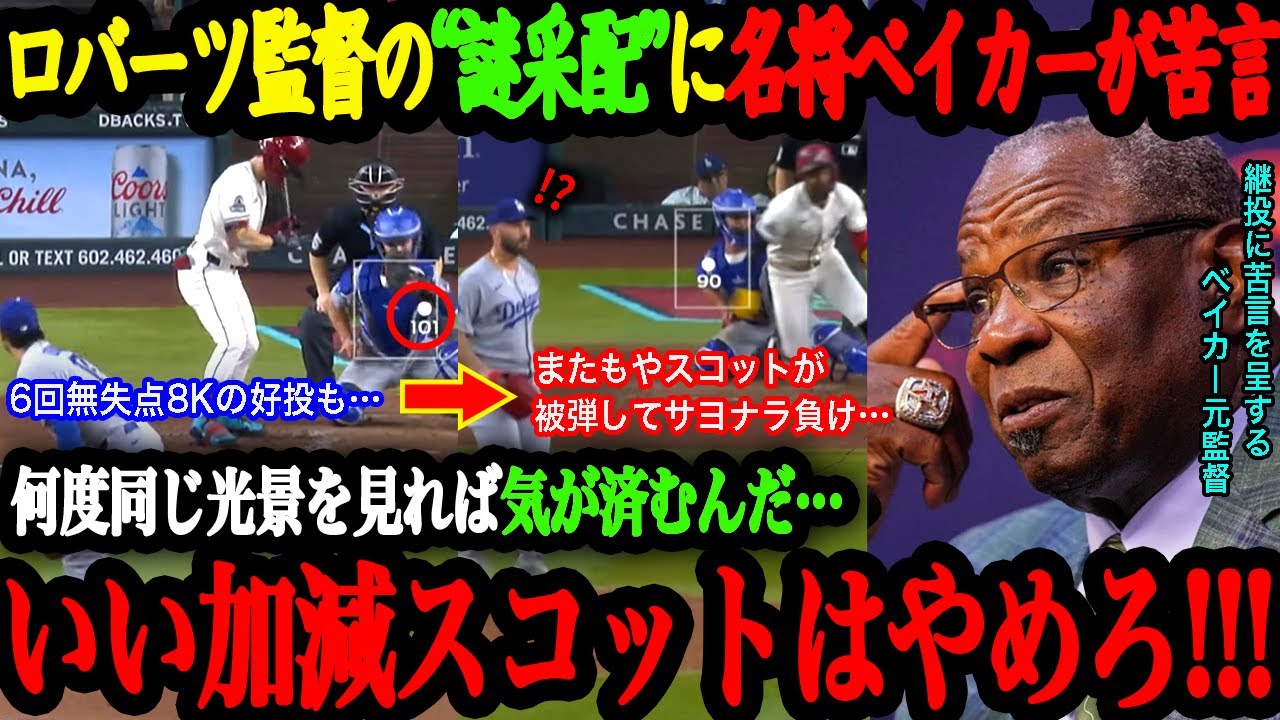 「私には全く理解できない」スコットを使い続けるロバーツ監督にベイカー元監督が本音激白!術後最長となる6回無失点8奪三振の好投も、またもやスコットが被弾しサヨナラ負け…【大谷翔平】【海外の反応】