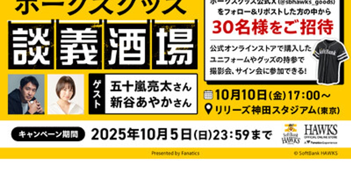 世界最大級のデジタルスポーツプラットフォームを運営するFanatics Inc.の日本法人、ファナティクス・ジャパン合同会社(東京都港区、マネジングディレクター:川名正憲、以下「ファナティクス・ジャパン」)は、ファンイベントとして『ホークスグッズ談義 Presented by Fanatics』(以下、ホークスグッズ談義)を、2025年10月10日(金)、東京都神田の野球居酒屋「リリーズ 神田スタジアム」にて開催します。ファナティクス・ジャパンは2018年に福岡ソフトバンクホークス(以下「ホークス」)とオフィシャルパートナーシップ契約を締結し、2019年よりHAWKS公式オンラインストア(https://www.softbankhawksstore.jp/)運営をしております。