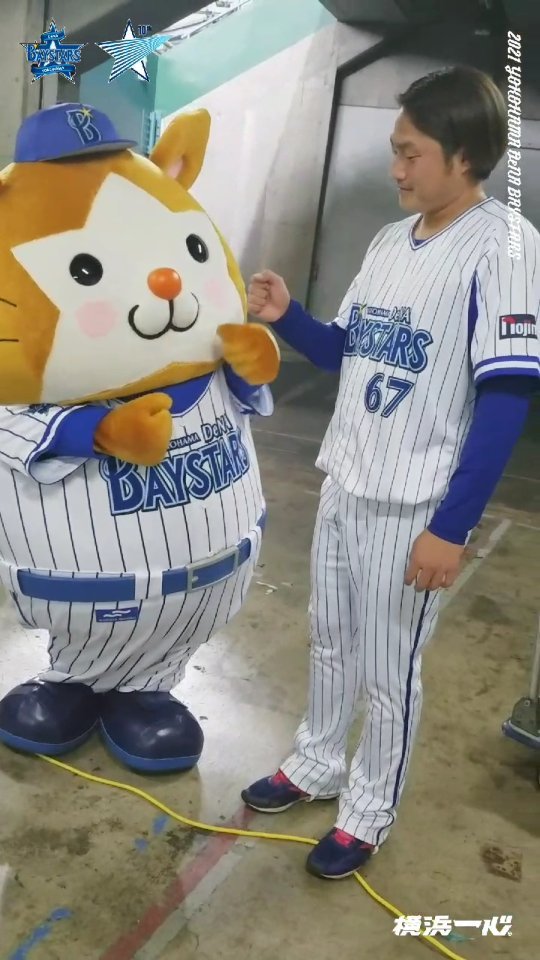 YOKOHAMA-DeNA-BAYSTARS: . 本日の予告先発は移籍後初登板となる #有吉優樹 選手! 先日 #スターマン にも挨拶していました . #スターマンとアリエッティ  #baystars…