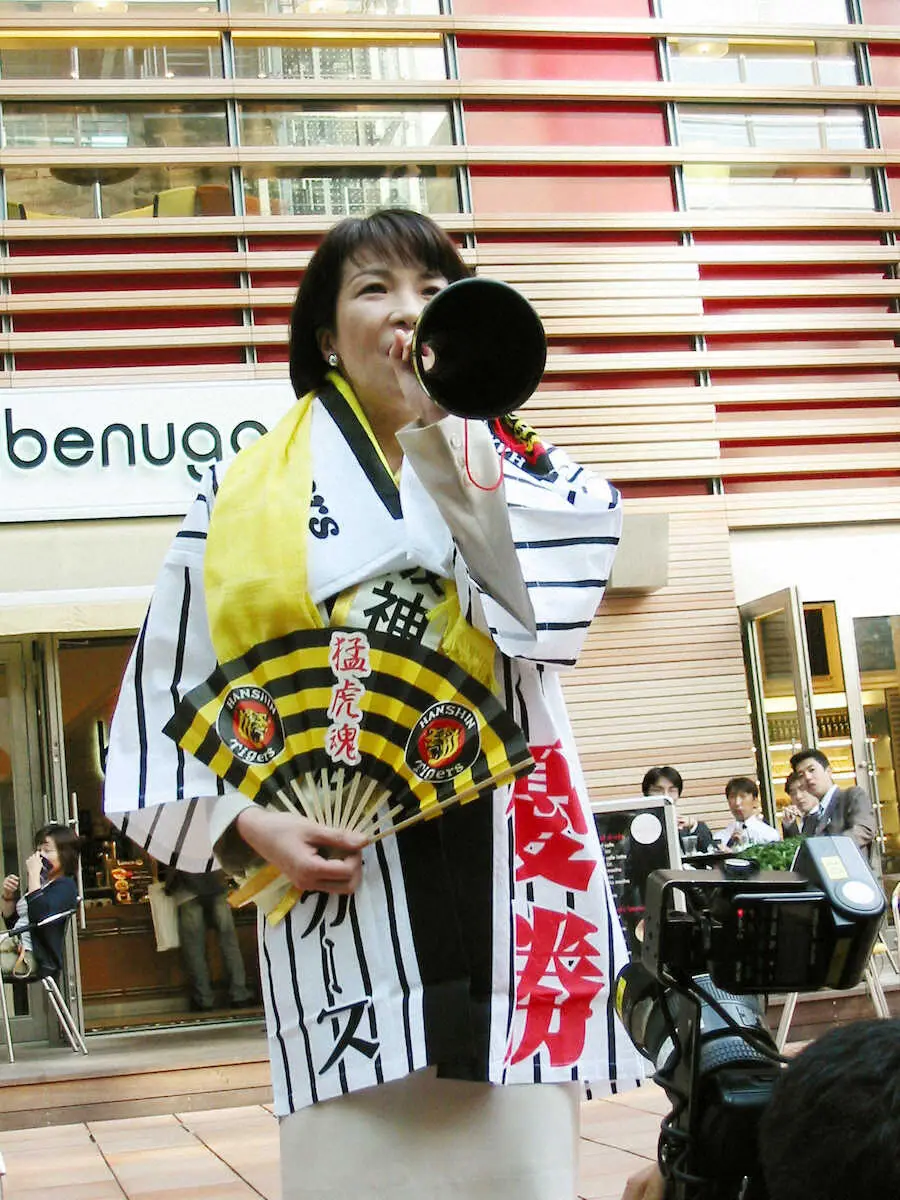 日本テレビ新社屋前で「六甲おろし」を熱唱した阪神タイガースファンの高市早苗経済産業副大臣(2003年撮影)