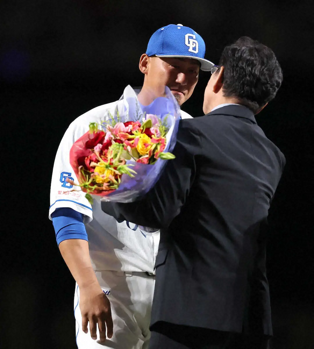 引退試合にサプライズで栗山氏(右)から花束を渡され涙を流す中田(撮影・椎名 航)
