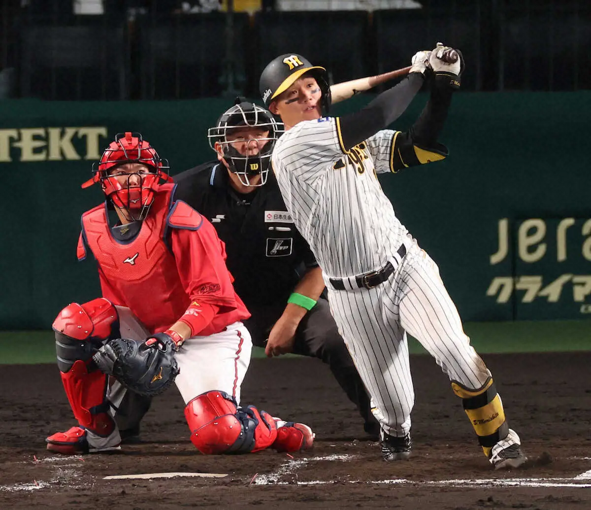 これまで23、24年で通算5試合に出場して打率・389、2本塁打、4打点。2本塁打は阪神選手で最多の福留孝介5本に次ぎ、生え抜きでは鳥谷敬、大山に並んで最多になる。初本塁打は新人の23年、広島とのファイナルステージ(S)第1戦で4回に九里から同点ソロ。CS(パのプレーオフを含む)で新人の本塁打は6人目で、初出場で打ったのは13年の加藤翔平(ロ)以来2人目だった。翌24年はDeNAとのファーストS第2戦の初回にジャクソンから先制のソロ。新人から2年連続本塁打は09~10年に野本圭(中)が記録して以来、2人目だった。
