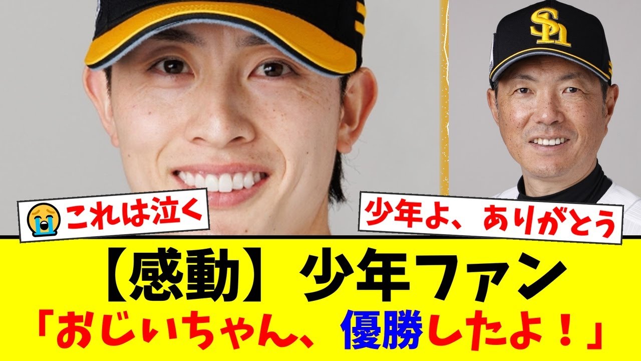 感動少年ファン、おじいちゃん優勝したよ。 3 日に行われたソフトバンクのホーム最終戦。試合後のセレモニーである少年の言葉が感動を呼びました。ソフトバンクの大ファンだというエト君はへ送りました。祖父の影響でホークスが大好きになったというエト君。 おじいちゃんは昔から野球が大好きでホークスが勝てば機嫌が良く負けると機嫌が悪いという昭和な感じの人でした と語り笑いを誘います。 続けて特に好きになったセンスとして頭教選手の名前をあげました。 走る打つ取るどれを見ても美しく僕の目標であり神です。 [音楽] 土代級の3 時を送ります。これには東選手も照れたよう悩みを浮かべました。野球の練習に励むエイト君は選手の体を気遣い。 [音楽] デッドボールや総塁などで怪我されることもあると思いますがあんまり怪我して欲しくないです。 [音楽] と申境を取ろ。さらに相手投資手へ向けて 対戦するピッチャーの方々デッドボール当てないでください。お願いします。 [音楽] と呼びかけ球場は温かい拍士に包まれました。最後に まだまだCS 日本シリーズと続きますが日本一になるまで頑張ってください。 トルを送りました。そして [音楽] 3月に亡くなったという祖父に向けて おじいちゃんフォークス優勝したよ と呼びかけました。この言葉を国監督もしっかりと受け止めるように拍手を送っていました。 この心を温まるセレモニーについて皆さんはどう思いますか?コメント欄であなたの感想をお待ちしています。ここからはネットの声を紹介します。リアルな反応を見てみましょう。もうだめだ。こんなの楽に決まってるじゃない。おじいちゃんに届いてるよ、絶対。 [音楽] わしも長年ホークスファンやってるが、こんな感動的なセレモニーは初めてかもしれん。素晴らしい年や。 [音楽] 本当にそうよね。 自分の息子みたいに思えちゃって涙が止まらなかったわ。しっかりしとくね。 マジで感動した。エト君。フォークスファンの感だろ。おじいちゃんも自慢すんやな。 シ東選手への僕の目標であり神です。てことは最大級の 3 時でトすぎる照れてる東君も最高でした。 それなしが神って言われてるの聞いてこっちまで嬉しくなったわ。習冬した方たん。 集東の走行全部美しいってのはガチで野球分かってるわ。少年将来有望やならあんまり怪我して欲しくないです。てファンの気持ちを大弁してくれてありがとう。本当にそれなんだよな。 [音楽] 本当にそう。先週みんな自分の体を大事にして欲しいわね。リト君優しい子だわ。 対戦するピッチャーの方々ボール当てないでください。わすぎて草。 [音楽] これは前球団のピッチャーに届け w できながらこれはほっこりしたわ。うちの投手人も手加減んけどインコースは優しめになるかもな。 W ファさチームのファンからもコメントが来るとは。 Wエ君の影響力すげえな。 W 国防監督がうんって頷きながら拍手してる姿に潜っときた。チームの雰囲気が良い証拠よね。 ああいう場面で監督がしっかり受け止める姿勢を見せるのは大事なことだ。 大機につがる良い最終戦だったな。 エト君とおじいちゃんの関係性エモすぎる。フォックスが家族の絆をついでるって思うと泣ける。分かる。勝てば機嫌が良くて負ければ悪いおじいちゃんうちのお父さんみたいで泣きひ [音楽] わしらの時代からホークスは家族みたいなもんやった。こういう若いファンが受け継いでくれるのは嬉しい限りやで。 最高の最終生セレモニーだったな。 この感動を力に変えて CS、日本シリーズも勝ち進むぞ。 こういうのがあるから野球はやめられないのよね。ホークスを応援してて本当に良かった。 泣せやがって。よし、俺も明日からまた仕事頑張るか。選手たちも日本一まで頼むで。ほんまに。 [音楽] エト君のスピーチ何回見ても泣ける。言葉の [音楽] 1つ1つが純粋で心に響くわ。 それな。特におじいちゃんフォークス優勝したよ。 わ、反則だろ。霊戦崩壊したわ。 昭和な感じのおじいちゃんって表現も良かった。目に浮かぶようだわ。 新東選手が照れてるのマジで重い。少年からの真っすぐな言葉って嬉しいだろうな。ウと尊い。 あの笑顔は国報級でしたね。ファンの言葉を紳摯に受け止める東君。素敵です。 橋行これを見ても美しいってのは的確な評価。野球をよく見てる証拠やなら。 相手ピッチャーへのお願い。 普通に考えて全代見で草。でも誰もが拍手しちゃう空気感。最高よ。 W あれで相手の陰行ス攻めを躊躇させられたらある意味高度な戦術かもしれんぞ。 W まあうちは普通に内閣切りしく行くけどな。震え声え。でも当てたらマジで気まずいやつやんけ。 W 卓球団ファンまで巻き込むエイト君。何者なんだ? W 国防母監督の父親のような優しい学しが印象的だったわ。 選手も少年もみんな見守ってる感じがして、 あの拍手にはいろんな思いがこもってたんだろうな。チームを引き入いるものの覚悟みたいなものを感じたよ。 昔はもっとヤジとかも多