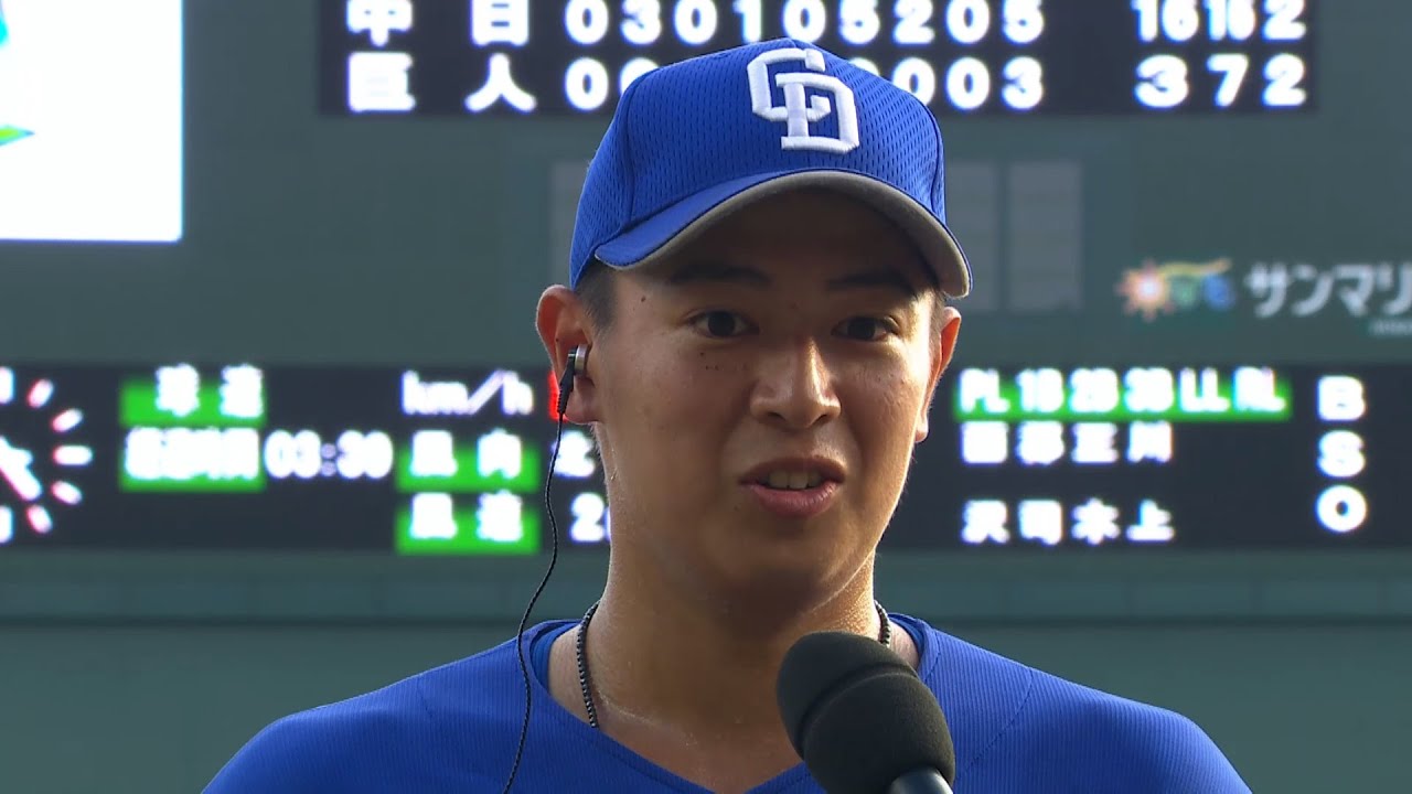 ヒーローインタビューは先発投手として5回1/3を2安打6奪三振無失点の好投を見せた、中日・仲地礼亜投手