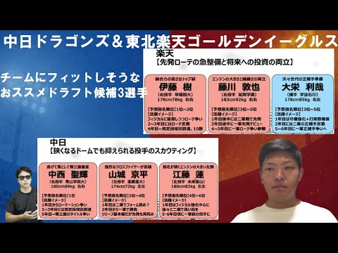 え、今回はですね、山県さんの、ま、ドラフトおすすめ選手球団別にやっていただいてますが、え、 3位あ、4 位チームというところでですね、お話しいただきます。山さん、よろしくお願いします。 よろしくお願いします。 はい、じゃ早速ですがでしょうか? はい、えっと、ま、この動画、このシリーズですね、え、ま、 5位、あ、6位、5 位という順番でやってきまして、今回 4位の、え、S リーグが中日、パリーグが楽天です。 え、ま、このドラフト、今年のドラフトで こう、ま、こんな指名できたらいいのか なっていう一言で、あの、ま、イメージし つつこうおすすめの選手3人ほど紹介させ ていただいております。で、え、ま、竹石 選手と石垣投手はどの球団も欲しいかなと いうところで、え、外、それ以外の選手 から3に 出ております。はい。 ということで、今回中日から、え、ま、狭くなる道も抑えられる当初のスカウティングということで、 あの、 来年からこうバンテリン道ムにこう照らす席がついて、あの、今までのよりこう少し狭い企画になります。 で、ま、こう、そういった中でやっぱりそのそこでこそやっぱり打てる選手ということで縦石選手とかあの野シっていう声もありつつ、え、ま、ちょっとピッチャーの方も整備をしてかないとあであったりとか、赤投手、あ、ま、行くメジャーに挑戦したりとかっていうこと考えてくと、ま、そこのこうピッチャーを固めていく必要もあるかなていうところで、ま、そのピッチャーを中心に行くようなイメージか なっていう風に個人的には思っております。 なるほど。なるほど。 もちろんあの井1 番縦井選手とかで全然ですけど、 その野種の指名とこバランス見ながらですねということではい。じゃあ、え、 1人目。はい。 うん。 え、ま、大山学院の中西投手ということではい。 ま、この、え、果石選手とかを1位で、 野種の選手1位で指名しちゃうと、ま、 ちょっと指名はできないかなっていう予想 順位1位で書かせてもらいましたけど、 あの、ま、ピッチャーで行くなら、まあ そうですね、大学生で言うとナンバーワン に近いところにいるかなと思 うん。はい。まあ1位でしょね。はい。で 、ちょっとこの今年1年間この春もあと 夏バ大学代表でところであの結構投げてき てるので1年目からあの万全にこう投げ られるかなっていう不安はあるんですけど も万全だったとしたら1年目から もローテーション うん くらいの能力はあると思います。で、ま、 2年目、3年目っていうところで、ま、 規定投球会140イニンググっていう ところに到達して、5年目くらいからも、 あの、脱三種のタイトル争いというところ で、ま、1番上に書きましたけど投げて 落としてっていうところで、あの、結構 やっぱと々の大学、ま、打車もレベル高い んですけども、そこ中でも先発して三振を 量産できているっていうのは、あの、こん 中にしとすごい評価できるポイントかなっ ていうところで、仮にこの先発として はまっ でいくのが厳しくても、あの、後ろの方でクローザーとかっていう適性も、あの、結構あるんじゃないかなっていう風に時期には見ております。 うん。 ま、このスライダー系とこのとスプリット系ですかね。で、あの、 2 つ使えるっていうんで、ま、あと結構カーブとかもあって、換球もあってっていうところで結構こうストレートも 150km とか出るピッチャーなんですけども、あの、ま、勝負点の多いピッチャーかな。 うん。うん。確かに そうっすよね。三振ね、本当に取れるのがね、すごいですよね。うん。 中西。 そうですね。もうあの、中西投手を 1位で行くとしたら野種は例えば 2 位とかになっちゃうかもしれないですけど うん。うん。うん。 ま、ちょっとそのくらいの価値のある投手だとは思います。 うん。全然こっちもありそうな。結構縦石選手派ドラゴンズ多いんですけど、僕も全然中西都最初とかはうん。ありえるかなと思ってますけどね。うん。 [音楽] はい。で、じゃあ 2人目ですね。 はい。えっと、同じからのアジア大学の山城投手です。うん。 はい。ま、この強烈なクロスファイアが武器ということで左ピッチャーでとしてはそんなに大きくはないんですけれども、 あの、ただまっすぐは150km 超えてきて結構あの右バッターのインコースが決まるとバット出てこないぐらいのあの位のボールが来るので、ま、そこがあの特徴的な投資かなと思っております。 うん。 ま、ちょっとその春は結構成績良かったんですけども、まずちょっとうん。 え、大学の代表にせ、選出されたんです けども、ちょっとそこで不安定な状態で、 ま、ちょっとそんな状態も引きずっちゃっ てるかなっていうこまでの状態なんです けどもなのでちょっと予想順位としては1 使名は春の状態で言ったらあったかもしれ なかったですけど2 位とか2位から4 位くらいまでにもしかしたら おお リップする可能性もなきにした 能力で言えば4位とかで指名でき
