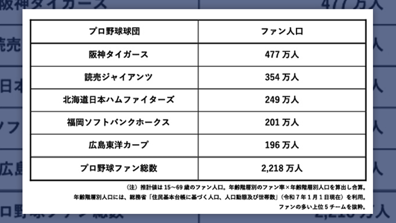 阪神ファンが大幅増加!野球人気はさらに上昇―スポーツマーケティング基礎調査2025 – Page 2  AdverTimes.(アドタイ) by 宣伝会議スポーツ観戦のチケット代、年間1.7万円で過去最高 民間調べ  日本経済新聞【速報】2025年スポーツマーケティング基礎調査 阪神タイガースファンが大幅増加、477万人に。好きなスポーツ22年連続首位の「野球」人気がさらに上昇。  新潟日報デジタルプラス【速報】2025年スポーツマーケティング基礎調査  FNNプライムオンライン阪神ファンが大幅増加!野球人気はさらに上昇―スポーツマーケティング基礎調査2025  AdverTimes.(アドタイ) by 宣伝会議