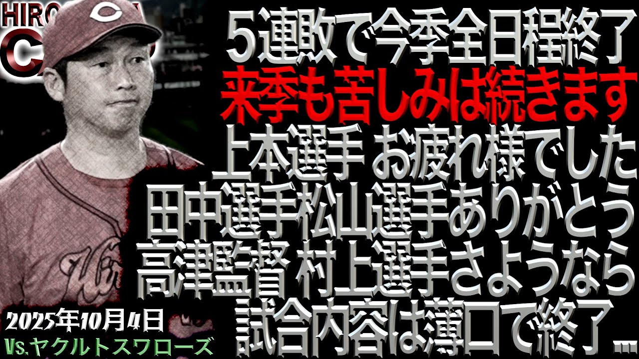 お疲れ様です。KTです。今日は10月の 4日ということで、本日もKTチャンネル ご視聴いただきましてありがとうござい ます。はい。え、今ですね、緊急で動画の 方を回しております。ちょっとこれ言い たかっただけなんですけども、え、時刻は 現在16時45分ということで、今ですね 、ちょうど、え、最終戦セレモニーが行わ れて、上本さんのご家族が、え、花束を 増定してですね、え、記念撮影の方に移っ ているという段階で、え、撮影の方をね、 始めております。はい。というわけでも 今日はね、ちょっといろんなことがあり すぎてね、どこから喋っていけばよく わかりませんが、え、まずはチームの ところからでいきますと、え、今シーズン 最終戦に破れ5連敗、え、2010年の 借金、え、26以来の15年ぶりの借金 20の5位で、え、シーズンを終えたと、 え、いうことでですね、ま、セレモニー やっておりましてね、え、ま、おそらく今 多くのカープファンの方がですね、え、涙 を流していると、え、いうところなんです けども、ま、これはあの上本選手、それ から田中孝介選手、え、松山竜平選手に 対する、え、涙だとは思うんですけども、 ま、あのね、そんな中で平気でこうやって 動画で喋っている私はちょっとサイコパス 奇質なところが、え、あるのかもしれない んですけども、ま、やっぱりカープファン なんでね、あの、常に前を向いて、え、次 へ切り替えてというところが大事かなと いうことで、ま、そこは切り替えてですね 、え、来期に向けて頑張っていくという ために、え、今日も喋っていこうかなと、 え、いう風に思います。はい。ということ で本当にね、今日いろんなことがあってな んですけども、ま、先ほど新井監督の、え 、最後のね、え、コメントもありました。 で、場内、あの、どめえておりましたね。 え、悪い方で土めえておりました。え、 来期も苦しみは続きますと、え、いうこと で、もうしっかり断言してくれました。ま 、これはですね、昨日の動画で私が言った ように、あの、やっぱり新井監督に届いて ますね。私の動画は絶対見てくれていると 思います。あの、ガラ系でYouTube 見てくれていると思います。はい。あの、 軽々しくね、来もう1回優勝目指します なんて言うと逆に、え、ファンは覚め ちゃうよと、え、いう風に言ったんです けども、本当に来は苦しみは続きますと、 え、いう風にね、え、宣言してくれました んで、で、え、その、そっからね、もう 逃げずに絶対早がってくんだと、え、いう 風に力強く宣言していただきましたんで、 もうこれはね、あの、本当に苦しい時期 続くと思いますが、え、ついていくしか ないんじゃないかなという風に思います。 あの、上辺でいいことをね、え、言うので はなくて、本音でしっかり、え、喋って くれたという風に思いますので、え、結構 ね、場内こうざついてですね、え、新井 監督も次の言葉になかなか行けなかった ような雰囲気あったんですけども、ま、 その後のね、え、逃げずにもう本当に 立ち向かっていきます、頑張っていきます というところでもう1回こうね、声援に 変わりましたんで、え、ま、それもね、え 、新井監督も素直な自分の気持ちを喋って くれましたし、え、現地にいた、え、 カープファンの皆様も素直な、え、気持ち をね、表表現してくれたんじゃないかなと 、え、いう風に思います。はい。で、上本 選手からもありましたようにね、え、 いろんな選手入ってくると、え、いうこと で、あの、来期以降ね、また頑張っていか なくてはいけないと、え、いうところに なりますので、え、そうですね、新井監督 をいつか同上げできるように、え、ま、 来年が最後ということでもないんでね、 あの、おそらくもう少し長く続くという風 に思いますんで、ま、上本選手もあの重み のあるコメント残してくれましたので、え 、来はね、え、ま、来じゃなくても、え、 いつか、え、新井監督を同上げできる日が 来ると、え、いうのも信じてですね、え、 これからも応援していきたいなという風に 思っております。はい。というわけでです ね、え、ま、今日の試合この後振り返って いこうかなと思うんですけども、え、ま、 まずは上本選手お疲れ様でした。で、え、 表現はやっぱりあえて変えて田中、え、 孝介選手、それから松山竜平選手には、え 、ありがとうということでね、え、お疲れ 様ですという言葉は、え、使いません。え 、来、え、できることならNPBでね、 もう1回プレイしている姿を見せて いただきたいんですけども、ま、そうじゃ なくても本人たちがね、え、燃え尽きる まで、え、やるという風に決めたのであれ ば、あの、NPBじゃなくてもね、え、 どこか他のところで、え、野球をやって気 の済むまでね、え、プレイしていただき たいなという風に思っております。はい。 そして今日はスワローズにとってもと言い ますが、セリーグの今日は最終戦という ことで、