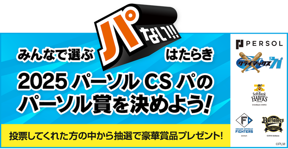 パシフィックリーグマーケティング株式会社(本社:東京都港区、代表取締役CEO:新井 仁)および「2025 パーソル クライマックスシリーズ パ」進出の福岡ソフトバンクホークス、北海道日本ハムファイターズ、オリックス・バファローズは、2025年度パシフィック・リーグタイトルパートナーであり、クライマックスシリーズ パ協賛社である総合人材サービスのパーソルホールディングス株式会社(本社:東京都港区、代表取締役社長 CEO:和田 孝雄)が「2025 パーソル クライマックスシリーズ パ」のパーソル賞をファン投票で決定し、抽選で豪華賞品が当たるキャンペーンを実施いたします。