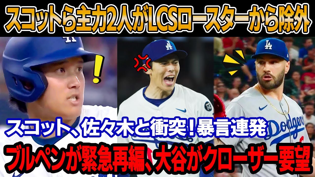 スコットと主力2選手がナ・リーグ優勝シリーズの26人ロースターから外れ、今季終了 ! スコット激昂、佐々木に暴言連発!佐々木パニック!大谷に助け求む ! ブルペンが緊急再編、大谷まさかのクローザー要望