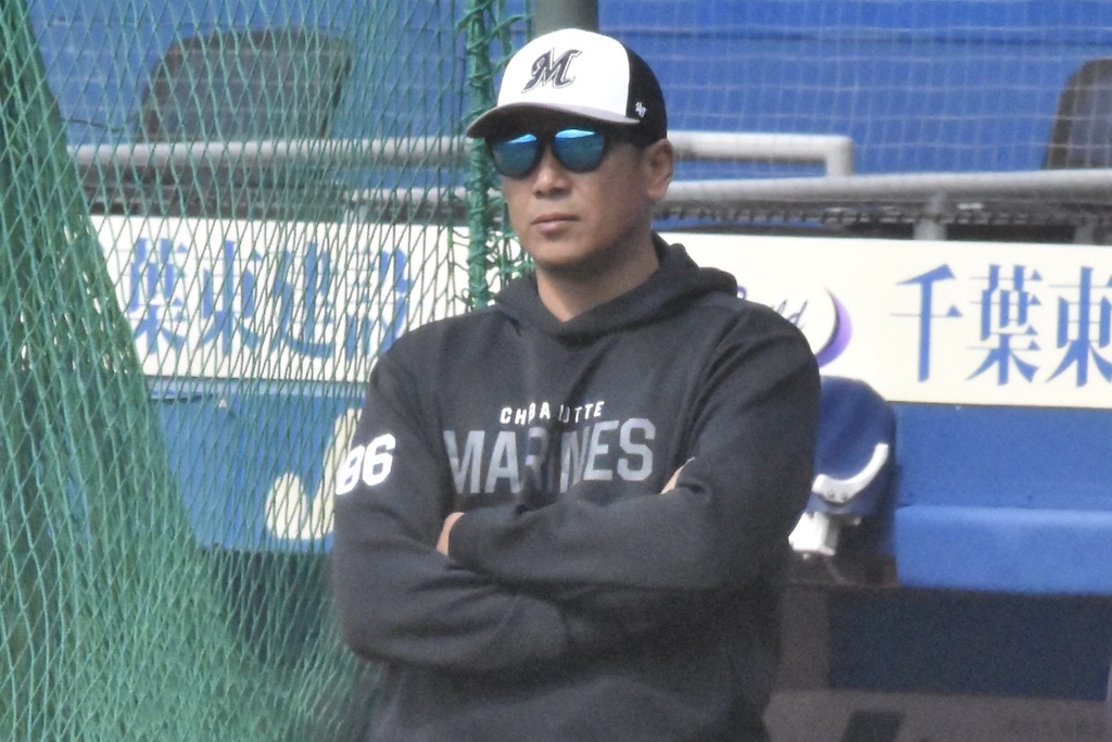 選手たちの練習を見守るロッテ・サブロー監督(撮影=岩下雄太)