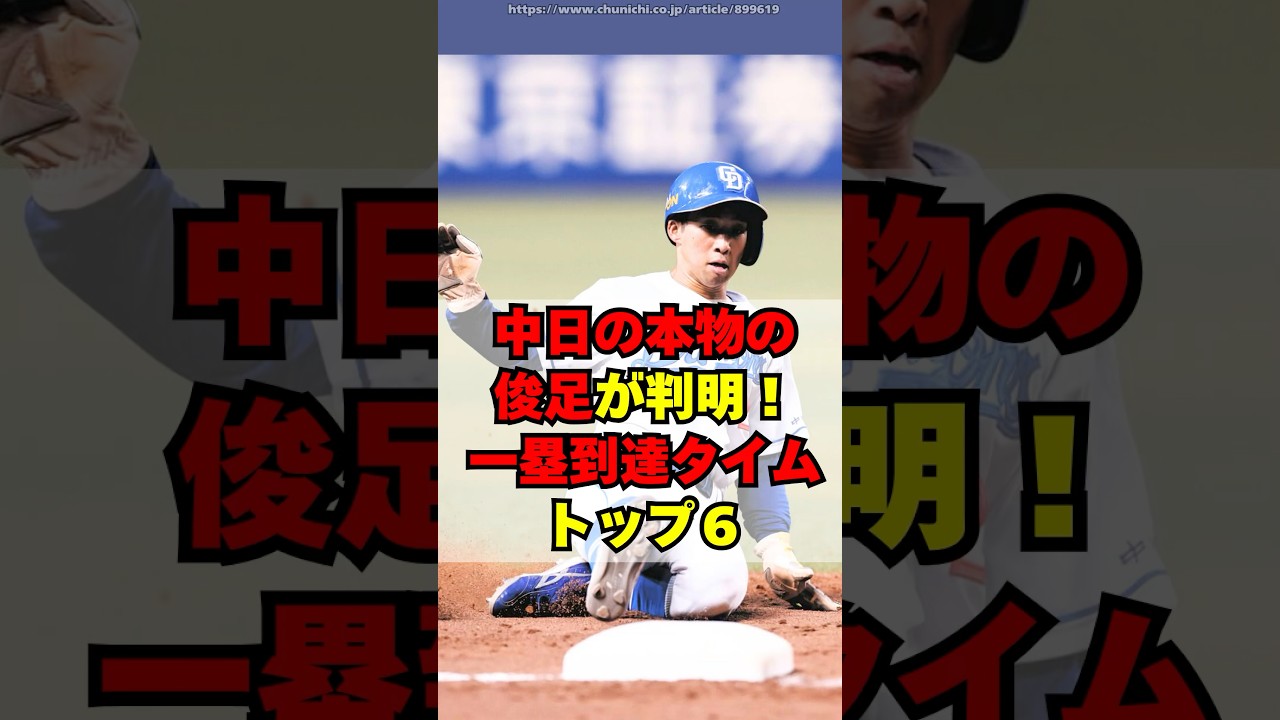 中日の本物の瞬速が判明。1塁到達タイム トップ6。NPBからリリースされた NPBプで中日の累間最高タイムトップ6 を集計しました。第6位は大ベテランの 大島。40歳を迎えるシーズンながらも 最高3.94秒を記録。盗塁も4つ全て 成功。まだまだ2026年も現役続行と なりそうです。第5位は辻本。右出し ながら3.87秒を記録。2軍では打撃が 大きく向上しており、レギュラー争いに 期待です。第4位は土田竜ク3.84秒を マーク。3年続けて打率1割台も2軍では 大きく成長しており、来年こそブレークに 期待です。続いて同立に1人目が上林。 アキレス断列から復活して3.76秒を マーク。7年ぶりの規定到達と事故最高 27等塁をマークしました。もう1人の 同立2位は右出しながら3.76秒の田中 や。打力も向上して来シーズンは規定打席 到達を目指します。第1位は3.56秒と 2位と0.2秒差もつけて第1位の選手 17塁リーグ最多の8本の3塁だと足を 生かした活躍を見せた選手は第1位岡林佑 H