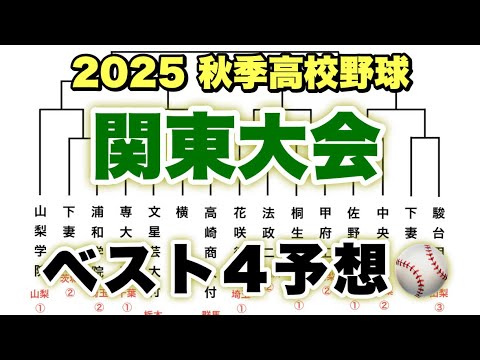 [音楽] どうもサンド飯甲子園チャンネルです。 2025年集期高校野球来年の選抜出場を かけた新チーム同士の熱戦が各地で 繰り広げられています。今回は10月18 日に開幕する関東大会を徹底ピックアップ 。競合をひめく関東地区でベスト4に進み 選抜格ランプを灯すのはどのチームか。 注目校の最新情報をもに戦力分析と展望を 分かりやすく紹介していきます。それでは まず関東大会の組み合わせをチェックして いきましょう。ここからは各ブロックごと に注目チームと展望を紹介していきます。 まずAブロックは夏の甲子園ベスト山梨 学院が開催山梨1位通過でスーパーシード 県を獲得。下妻一と裏学院の勝者が勢い そのままに抜け出せるか注目です。B ブロックは前年優勝の横浜が本命される 一方、講手に完成度の高い仙台マ度も 侮取れません。ベスト4進出をかけたハイ レベルな戦いが期待されます。Cブロック はコロナ禍で大会中止となった2020年 以来の選抜出場を目指す花崎徳春と桐流 第一が軸。先輩たちの思いを背負った競合 校同士による注目の激突です。Dブロック はまさに今戦模様。千葉大会準優勝から 巻き返しを狙う中央学院が守りに提評の ある栃木1位佐野日台茨城1位下妻に挑む 小図です。それではここからはお待ちかね 各ブロックのベスト4進出予想を発表して いきます。Aブロックは山梨学院。この夏 甲子園を明せたサバ投手。二刀流 スラッガー小田選手を軸に秋も山梨大会を 制覇。東投手は秋以降も安定感抜群の投球 を続け守りで試合を作ります。打線も小田 選手中心に繋がりを取り戻しつつあり、 チーム全体の完成度はさらに上昇。関東 大会では小田選手の投手復帰も示唆されて おり、5年連続選抜出場へ隙のない夫人 です。Bブロックは横浜選抜連覇へ向け新 チーム以降も東打田共もに圧倒的な戦力を 誇り神奈川大会を制覇しました。世代屈の ウ田投手はマウンドだけでなく打撃でも 存在感を発揮。二流田選手も投手として 対当し厚みのある投手人を形成しています 。打線は小野選手、池田選手、江坂選手が 経験豊富な打車が並びどこからでも得点 できる破壊力。劣星を跳ね返す勝負強さも 顕在で今年も優勝候補のヒットです。C ブロックは花崎徳張春。最速145km ウ川投手を中心に祝井選手、笹崎選手、 さ木選手ら全チームの主力が顕在さらに 石田投手小賀投手の1年生投手コ尾も対当 し当手人の厚みが増しました。まだ発展 途上がら激戦ブロックを埋評版通り 勝ち抜いた埼玉大会優勝の粘り強さは 見逃せません。6年ぶりの選抜へ戦力は 着実に整っています。Dブロックは中央 学院総手揃う石井井選手を中心に池田タ斗 投手池田高斗選手ら全チームからの主力が 残りチームの柱は安定さらに2年生 スラッガー菊選手に加え神永投手上島投手 ら1年生も対当し世代交代も順調です。 千葉大会は準優勝に終わったものの高い 攻撃力と硬い守備。熱い選手層は顕在。2 年ぶりの選抜を狙えるだけの力をしっかり 備えています。以上関東大会ベスト4 進出校予想をお届けしました。激戦区関東 の戦い。選抜キップをたり寄せるレスト4 へコマを進めるのは果たしてどのチームか 。皆さんの予想も是非コメントで教えて ください。中期大会はいよいよ選抜を左右 する大事な戦いやと突入しています。ここ から本格化する新チームの戦いに注目です 。このチャンネルでは高校野球の最新情報 や大会展望をお届けしています。 チャンネル登録と高評価も是非よろしくお 願いします。それではまた次回の動画でお 会いしましょう。