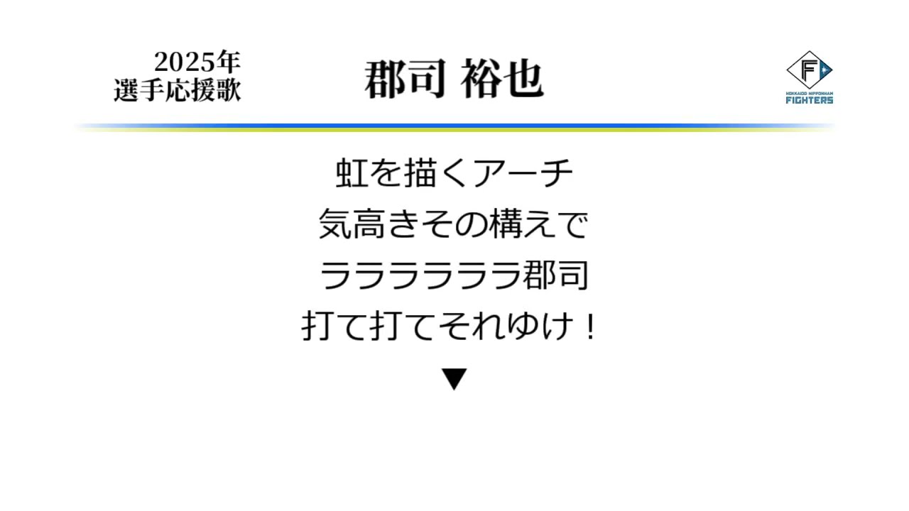 北海道日本ハムファイターズ 郡司裕也 応援歌 [MIDI] [Music] [Music] Heat. Heat. [Music] Heat. [Music] 日本ハム郡司選手の応援歌です。 郡司・山本拓実←→宇佐見・齋藤綱記の複数トレードは、 近年まれに見る全選手移籍先で一花咲かせた成功事例となりましたね。 Hokkaido Nippon-Ham FightersHokkaido Nippon-Ham Fighters (Baseball Team)Yuya Gunji (Baseball Player)なんぶふじ北海道日本ハムファイターズ応援歌郡司裕也 NPBHUB.COM | The Fanbase of Nippon Baseball & Nippon Professional Baseball