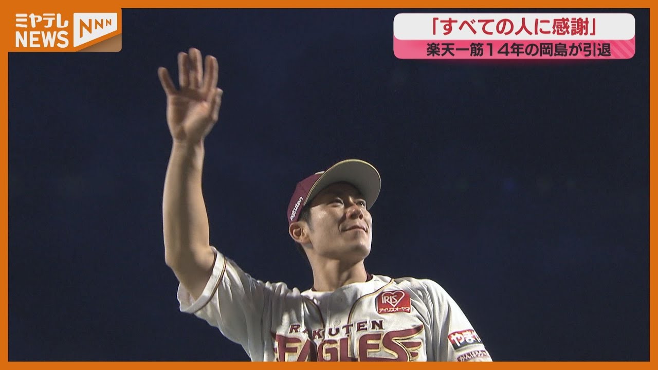 [音楽] スポーツはセアナウンサーです。 楽天は今シーズンの戦いが終わりましたね。 [音楽] はい。そうですね。4 年連続でクライマックスシリーズ進出を逃し、 4 位でシーズンを終えた楽。え、週末は岡島選手の引退試合、そしてシーズン最終戦が行われました。昨い行われた楽天筋 [音楽] 14年2013 年の日本一ン岡島武郎選手の引退試合。 岡島 多くのファンの大歓成を受けて 8 回村林選手への代打として登場した岡島選手。これが通算 11 試合目の試場。目に涙を浮かべて打席に立つと優秀伸び日を飾る通算 813 本目のヒットを放ち、現役最後の打席を終えました。 [音楽] 岡島武郎選手。 そして試合後に行われた引退セレモニー進仰のなる人たちからのメッセージが届くと あなたの魂をイーグルスの若い選手が引き継いで 日本一ンバーの先輩松井和加和夫さんもサプライズ登場。 [拍手] そして家族からも花束が渡されるなど多く の人に愛され慕われた岡島選手を象徴する ようなセレモニーとなりました。 [音楽] 僕は引退に公開はありません。 ただもう1度 優勝したかった。 これからは1ファンとしてここにいる ファンの皆さんと 優勝の光景を見守りたいと思います。 岡島武郎に関わってくれた全ての人に感謝 します。 14年間本当に本当にありがとうござい ました。 [拍手] 島そして昨日およそ 2万6000 人が集まったホームでのシーズン最終戦選手たちが素晴らしい姿を見せてくれました。延長 10回に登板した藤平投手。危なげなく 3者凡体に仕留め29 試合連続無視点の球団記録を達成。素晴らしい投球でシーズンを締めくくります。 そして村林選手が埼アン打のタイトルを獲得。昨日のノーヒットもシーズン [拍手] 144アンダーを放ち、プロ10 年目で初のタイトル獲得です。 67勝74敗。2分けの4 位でシーズンの戦いを終えた天。試合後のセレモニーではミ [拍手] 監督が感謝を伝えました。 今シーズンも行く度となく ファンの皆様のたくさんの応援、ファンの皆様の大切さ、ありがたさ感いたしました。今週も皆さん本当にありがとうございました。 [拍手] [拍手] え、そして楽天の石井GMが最終戦終了 後日監督について来年もまたやって いただくと続頭を明言しました。