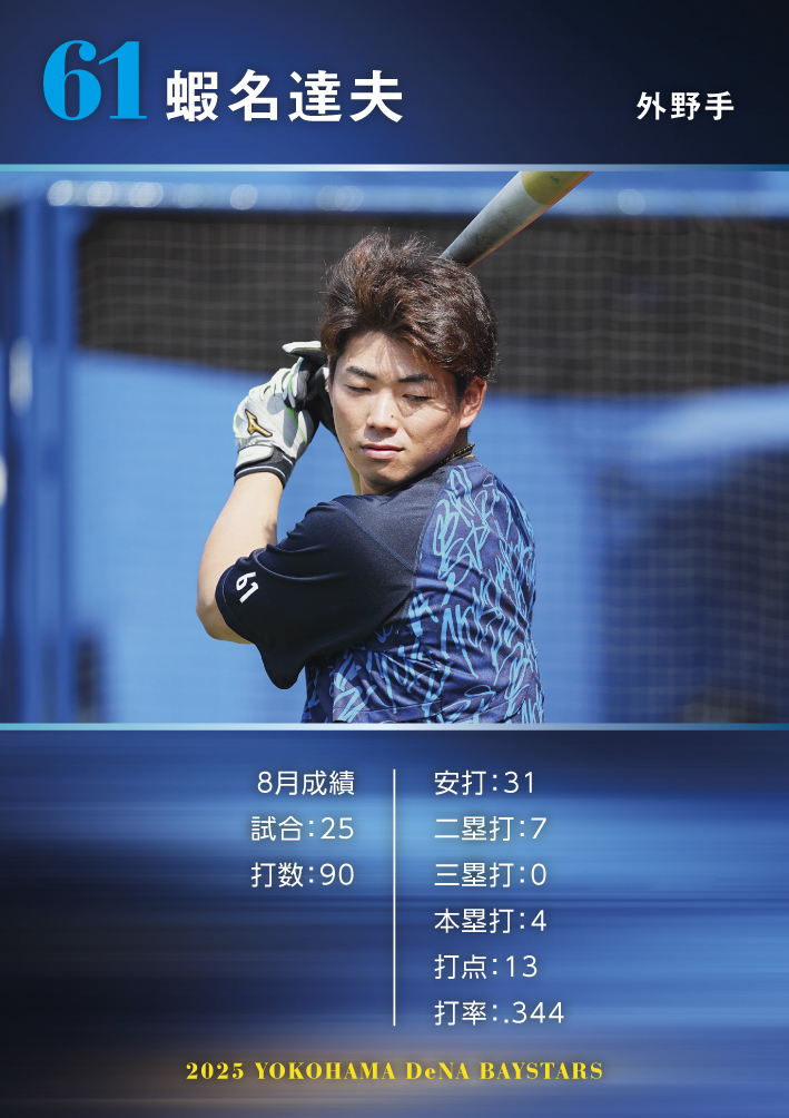 今回追加されるカードは、「MY BAYSTARS」アプリにて8月の観戦記録の投票で見事「みんなのMVP」1位に輝いた蝦名達夫選手のMOVIE付き☆☆☆☆スペシャルカード1種!