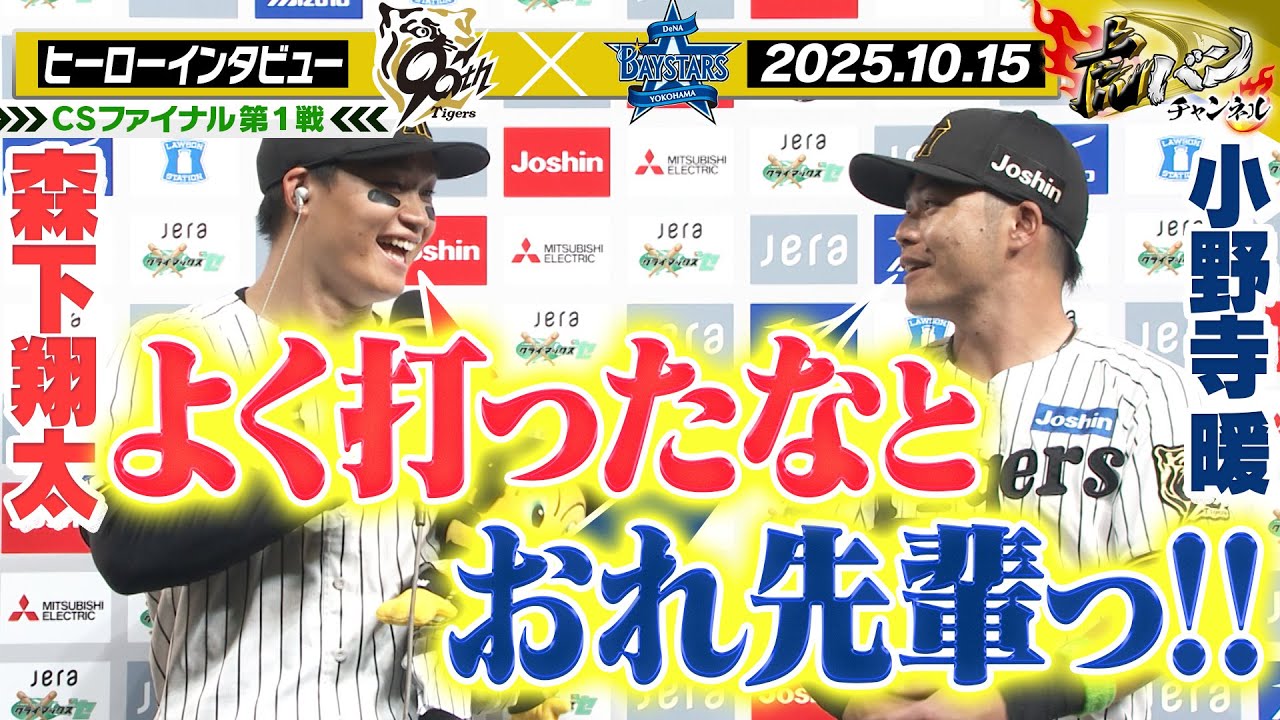 [音楽] トラバンチャンネル 放送席、放送席、そしてタイガースファン の皆さん、お待たせしました。ヒーロー インタビューです。 クライマックスシリーズファイナル ステージ初戦見事勝利しました。阪神 タイガース先制タイムリー森下選手。 そして貴重な2点目のタイムリー小寺選手 です。 まずは森下選手見事勝利しました。勝利した今の瞬間の気持ちへ教えてください。 いや、もう勝利することだけをあの 1 番においてやってたのでまずは良かったなと思ってます。相手高投手 [拍手] 0対0が続く中で6 回貴重な先制タイムリーでした。 あのタイムリーヒットかでしたか? いや、もうまず近本さんが、え、 3 等決めてくれたんですごく気持ちとしても、え、 1 つ重心がおりましたし、え、自分の中でも絶対打ったろうっていう気持ちがあったんではい。その気持ちの強く出しながらスキに立つことができました。 [拍手] 近本選手が出塁をして、中野選手が送る。 そして驚きの3頭もあって巡ってきた打席 でした。打ったバッティング振り返って いかがでしょう?いや、もうCSはあの 自分の打撃成績はもう1回0になってるん で、えー、もう打点ってところにすごく こだわりながらこのCSやっていきたいな と思ってます。 [拍手] このCSポストシーズン、去年そして昨年 と本当に勝負強いバッティングが印象に 残っています。改めてこのポストシーズン の勝負強さの要因そしてポストシーズンの 森下選手イメージってどう持ちですか? そうすね。 けど、ま、短期決戦は自分の中でも、え、やりやすいものがあるので、ま、本当チームの勢いもそうですけど、あの、その勢いに、え、うまく自分も乗っかりながら、ま、今日の試合はできたかなと思います。そして森下選手の先制タイムリーの後、再びチャンスを作ってお隣の小野寺のタイムリーヒフトヒット。 [音楽] どんな風にご覧になってましたか? いや、よく打ったなっていう。そ、そ、 先輩の小野寺選手改めて一言どうですか?森下選手から言葉ありましたか? え、そうですね。ま、自分でもよく打ったなと思いました。ただ今シーズンを象徴するような本当にチームとして打線としての粘りがあった 6 回の攻撃だったんではないでしょうか。かがでしょう。 いや、本当にピッチャーが、え、やっぱり ゼロを続けながら、え、ワンチャンスを物 にして、え、取ってくっていうのが タイガースの、え、勝ちのスタイルだと 思うので、え、ね、もっともっと ピッチャーを楽にできるような打撃をし たいなと思いますし、えー、やっぱり勝つ ことが1番なので勝ちに手していきたいな と思ってます。 その勝ち。今日勝利しまして クライマックスシリーズファイナル ステージ初戦取りアドバンテージ含め2勝 となりました。この勝利の意味改めて教え てください。やっぱりアドバンテージを 活かせるのは今日勝つことだったので、 まず、え、今日勝てて、ま、チームも すごいいい雰囲気なので、この勢いのまま やっていきたいなと思います。 それでは森下選手、最後に甲子園大くまし た。海岸に力強く一言ください。 明日も勝ちます。応援よろしくお願いします。 まずは森下選手でした。続いて小寺選手です。ナイスバッティングでした。 ありがとうございます。 [拍手] 先ほど一言いただきましたが、改めて今日の初打席でのタイムリーでした。 どんなバッティングでしたか? そうですね、あの、僕らしい汚い間に落ちる人だと思います。 チャンスが続く中で打席の中ではどんなことを考えてらっしゃいましたか? え、チャンスで回ってきたんで、え、後から行く選手でもありますし、その 1 打席で、ま、絶対結果を出すと思って、え、打席に立ってみました。 今シーズンはなかなか一軍での機控えが少なく打点がありませんでした。この大 1 番で今年初めてのタイムリーヒットです。改めてタイガースさんの声援どんな風に聞こえましたか? え、今日の声援も本当すごかったんですけど、えっと、 1年間ほとんど2 軍にいて、え、毎回応援に来てくれる方たちに今日はいい姿を見せれたらなと思います。 悔しさを持ってポストシーズン望んでるかもしれませんが、改めて優勝した今年のタイガースの強さ小寺選手どんな風に感じてますか? そうですね。ま、ほとんどテレビでしか見ていなかったんですけど、え、ま、見るたびに勝っていたんで本当に強いなと思いながら、ま、特に、ま、ピッチャー陣がいいんで今日みたいに、え、 2 点目取れたことがとても大きかったなと思います。 その強いタイガンスにこのポストシーズン 戦力として加わりました。ご自身どんな ポストシーズンにしたいか最後は元気よく タイガースファンに 一言お願いします。 ま、1年間シリーズ男にはなれなかったん で、え、明日から、え、またシリーズの男 になります。 見事クライマックスシリーズファイナル ステージ初戦勝利しました。阪神 タイガース、今日のヒーロー森下選手、 小寺選手でし