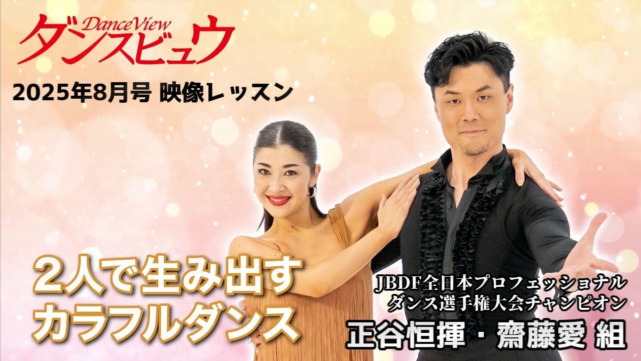 ダンスビュウ2025年8月号(19~23頁に解説記事)の「映像レッスン」で講師を務めるのは、JBDF全日本プロフェッショナルダンス選手権大会チャンピオンでラテンSA級の正谷恒揮・齋藤愛先生です。正谷恒揮・齋藤愛先生は映像レッスンに初登場となります。