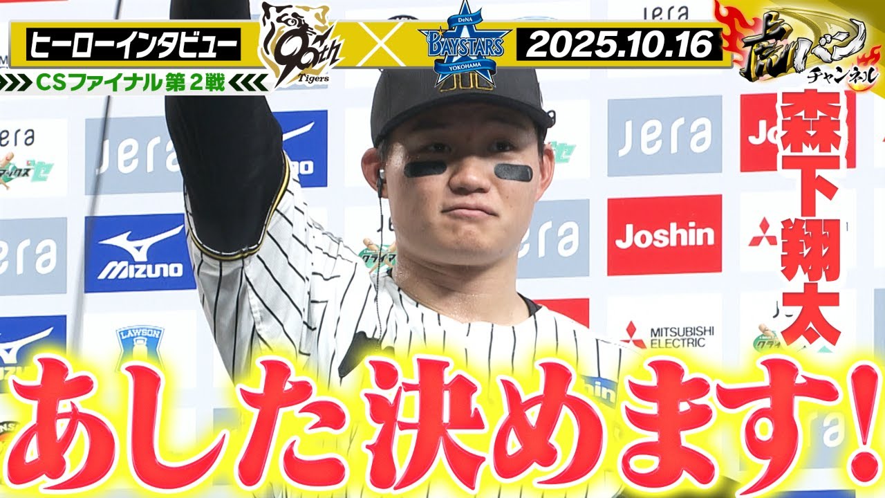[音楽] トラバンチャンネルオです。お願いします。ます。 [音楽] [拍手] [音楽] 放送席、放送席。そしてタイガースファンの皆様、お待たせしました。ヒーローインタビューです。今日のヒーローは昨日に続くお立ち代さよならホームラン。 [拍手] 森下翔太選手です。 まず森下選手少し球場を見渡していただい て改めて10時半を超えてこれだけのお客 さんが残っています。勝利の報告お願いし てもいいですか?勝ちました。 それではさよならの場面振り返っていただきます。同点で迎えた 10 回の裏でした。もう勝つにはさよならしかない。あのイニングをまず迎えた時回ってこい。どんなお持ちで、どんな気持ちで待っていたんでしょうか? いや、もうね、琢むさんが出てくれたんで、なんとか、えー、テルさんにいい形で繋ごうと思って、ま、打席に立った結果が、ま、自分もびっくりしますけど、最高の形になったかなと思います。 [拍手] もう自分で決めてやろうという思いはどうだったんでしょうか? いや、もちろんありましたけど、ランナ 1 塁だったんで、もうとにかく広げて、えね、会場と一体となりながら最後、あの、 10 回の攻撃したいなと思ってました。今会場と一体となりたいという言葉もありました。 [拍手] あの10 回そして今日の終盤以降の声援森下選手にはどう聞こえていたんですか? いや、何者がなくなってからも、え、すごいね、大きな完成っていうのは選手たちにすごく届いてたので自分にも聞こえてましたし、え、やっぱり琢さんがヒット打った時にね、会場がすごいわーっとなって、あ、これ乗ってきたなって自分の中でも思ったんで、その勢いのまま行きました。 [拍手] そして初球を振り抜いて打球はレフトスタンド。あの時の気持ちもう一度振り返っていただけますか? いや、もう内心は伸びろってね、あの思いながら走ってましたけど、えね、フェンス直撃だとしても卓むさんの足なら帰ってきてくれるだろうと思って、ま、自分も、ま、ホームランだと思ってなかったんで全力失走してました。 [音楽] [拍手] 入った瞬間はガッツポーズも飛び出してました。あの時の気持ち教えていただいてもいいでしょうか? いや、さよならホームランがね、自分の記憶では多分初めてだったのかなと思うんで、ま、どう対応していいか分からなかったですけど、ま、本当にすごく嬉しかったです。その自身初かもしれないさよならホームラン。 [拍手] [拍手] ウォーターシャワーをチームメイトがホスで待っていました。どうでしたか、あのウォーターシャワーは。 いや、もう最高に気持ちよかったですし、あのすごいね、今日の試合勝ち切ったなっていう実感が起きました。 [拍手] もう本当にもみくちゃにされてましたけれども、誰に何言われたとか何か覚えてるものありますか? いや、なん、もうね、めちゃくちゃあったんで本当に覚えてないですけど、ま、龍平にはあのバントしっかり決めとけって言ってきました。 [拍手] ま、この辺り勝ってカブトの王を閉めるというような感じですけれども、森下選手これでクライマックスシリーズ昨日と合わせて 7打数5ア打7割1部4輪。 どうしてこんなに勝負強いんですか? いや、もうできすぎですけど、本当にピッチャー人からね、あの、やっぱり前にいいバッターもいますし、後ろにもいいバッターいるので、もうその勢いのままにもう自分はガムシャルにやってるだけです。さあ、それでは改めて時刻は [拍手] 11時を近づいてまいりました。 ここまで残ってくれたファンの皆様に昨日は小寺選手がシリーズ男になるという強い宣言もありました。最後ファンの皆様がぶち上がる一言お願いします。 遅くまで応援ありがとうございました。明日帰って決めます。ありがとうございました。今日のヒーロー [拍手] [音楽] [拍手] 2 夜連続のヒーロー森下太選手でした。放送席どうぞ。 [拍手] [音楽] [音楽]