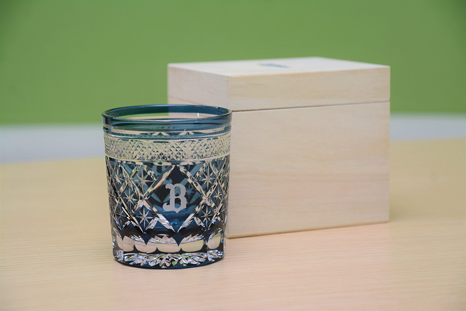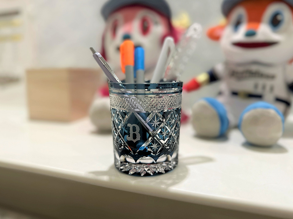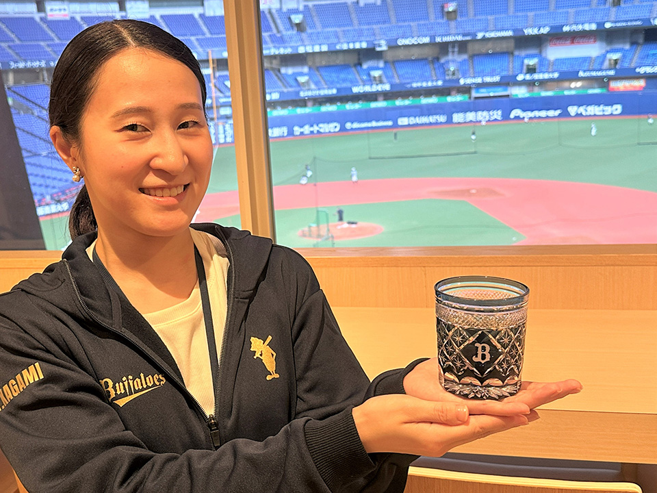 深いネイビーで彩られたガラスに浮かび上がる「B」のイニシャル。手に取って光にかざすと、星を思わせるカットが次々と輝く。一つ一つ手作業で丁寧に仕上げられた切子グラスは、今年のバファローズオフィシャルファンクラブ「BsCLUB」の入会グッズの一つ。担当した球団ファンクラブグループの鏡味佑満子は「ファンの皆さんの日常に溶け込める特別なグッズに仕上がりました」と笑顔を見せる。ファンクラブの入会グッズでは異例とも言えるオリジナルグラスには、鏡味の思いが詰まっている。