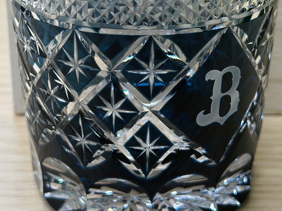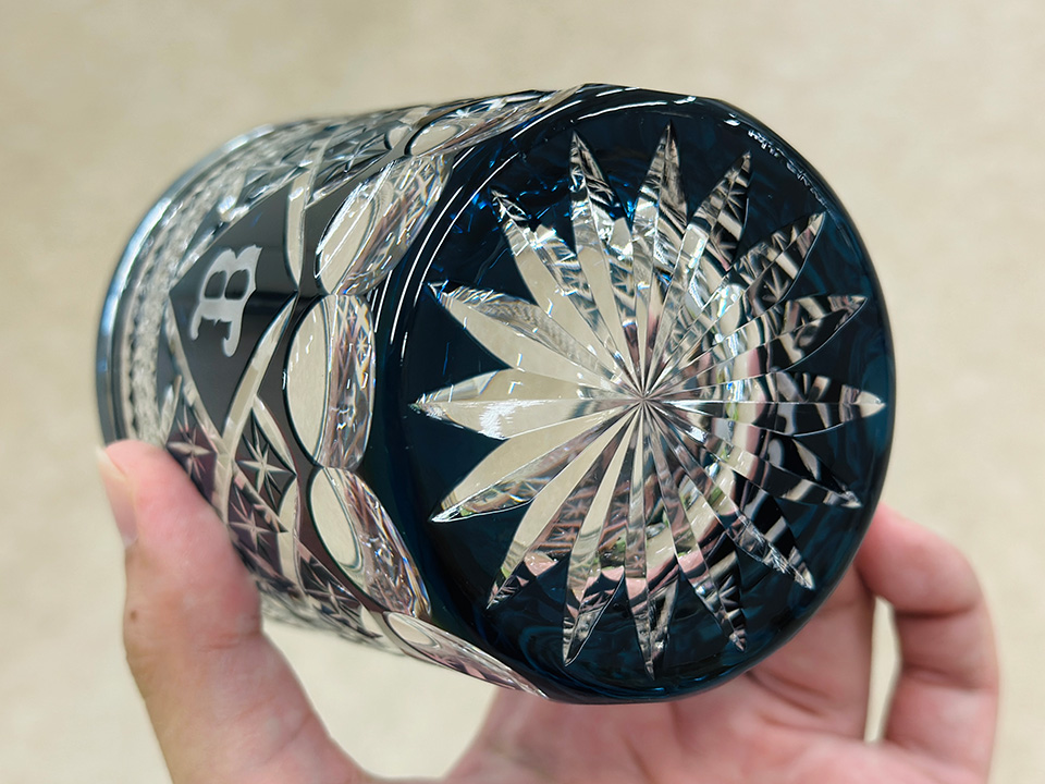 デザインの軸は、切子らしい「品」と「バファローズらしさ」。切子グラスは青と赤が定番とされる中、ネイビーの配色にこだわった。球団カラーと光の入り方をどう表現するか、慎重に調整を重ねた。