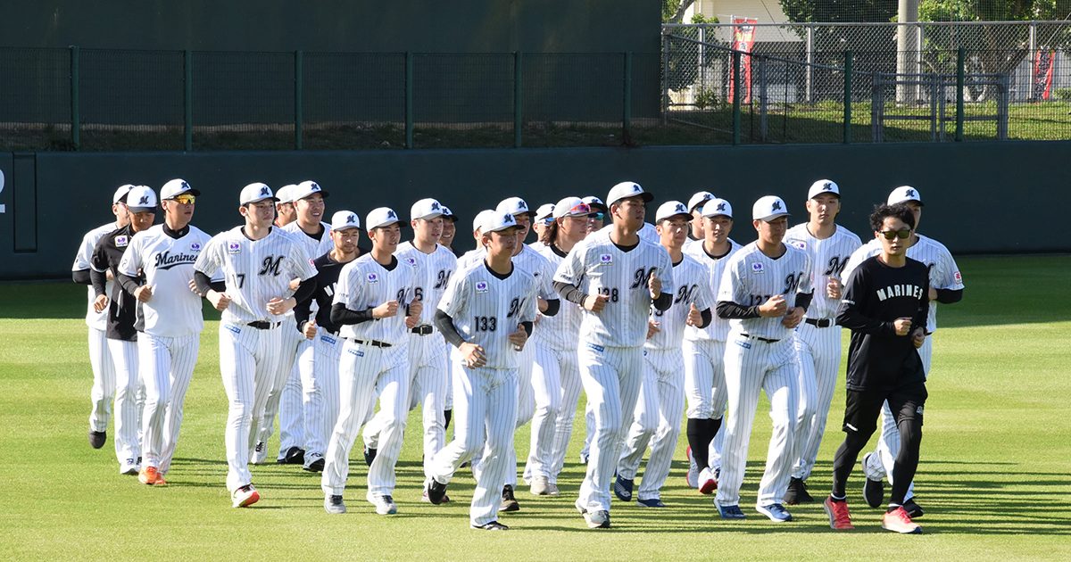 キャンプインし、ランニングするロッテの選手=2024年2月1日、ロートスタジアム石垣(旧石垣市中央運動公園野球場)