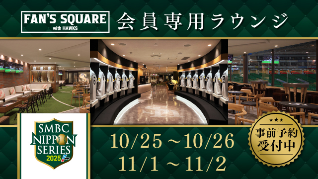 タカポイントでは、「SMBC 日本シリーズ 2025」期間中、みずほPayPayドームでの試合開催時における会員専用ラウンジ「FAN’S SQUARE」事前予約の抽選を受付中です!当日の観戦チケットをお持ちのダイヤモンド・プラチナステージ会員様のみお申し込み可能です。