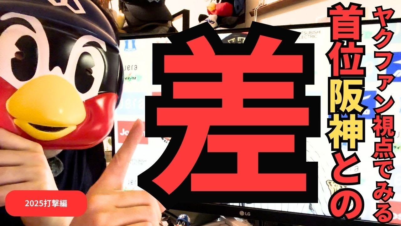 [音楽] ヤクルトファンチャンネル ベースボールデータラボ どうもこんにちはこんばんは。ヤクルトファンチャンネルベースボールデータラボです。え、全国のスワローズファンの皆さん、そしてタイガースファンの皆さんいかが過ごしでしょうか?はい。え、父ちゃんですね、え、 1 ヤクルトスワロズファンの私管理認点で、え、様々な野球に関する動画を日々お届けしてるチャンネルでございます。 え、もしこちらの動画が参考になりまし たらチャンネル登録いただけるととても 嬉しいです。はい、ということでですね、 本日の動画に入る前にまずはですね、安心 タイガースファンの皆さん優勝おめでとう ございます。はい。え、昨日ね、え、更新 で行われた、え、阪神タイガス対、え、 ベイスターズの、え、試合を持って、え、 クライマックスシリーズね、え、を持って 、え、阪神タイガスが、え、セリーグ優勝 、そして日本シリーズに駒を進めるという ね、そんな熱い戦いとなっておりました。 いやあ、本当にね、私もテレビの前で、え 、感染しておりましたけれども、いや、 とんでもないね。いやあ、今年の阪神の強 さを象徴するようなね、そんな試合で ございました。はい。ということでですね 、え、藤川監督引き入る、え、阪神に対す 優勝ということで、え、是非ですね、日本 シリーズも頑張ってください。はい、と いうことでですね、本日の動画、このね、 強い今年のね、強さ、え、をね、象徴する ような阪神タイガースですけども、そのね 、え、阪神タイガースに焦点を当てて、 本日はこちらでございます。はい。え、 2025年セリーグ1位阪神そしてね、え 、ま、ヤクルトファンチャンネルでござい ますので、え、このね、え、残念ながら 再開となってしまったヤクルートとのね、 こちらの差ということにですね、え、打撃 成績ですね、こちらに、え、焦点を当てて 、え、お届けできればと思います。え、 もしよければ最後までお付き合いください ませ。リレクテッバイベースボールデータ 。はい。ということでですね、え、こちら に、え、2025年今年のですね、薬類と そして阪神の、え、ôn別のね、打撃成績 の、え、比較をですね、おまとめさせて いただきました。各ね、指標別におまとめ したものになっております。ま、こうやっ てですね、え、比較していくとやはりです ね、その差というものがですね、え、 かなり、え、浮き彫りになってきて見え ましたので、え、ちょっとこちらでね、お 届けできればと思います。まずはね、上 から行きます。え、打率ですね。え、阪神 2割ヨフ5輪、え、4位ですね。え、 セリーグ地球4位。え、そして、え、 ヤクルトは2割3部4輪ということで、え 、セリグで5位となっております。はい。 そして、え、得点ですね。え、496点、 え、阪神2位ですね。こちら素晴らしい。 はい。そしてヤクルト443点ということ で、え、2025年、え、トータルではね 、53点差ということで、え、このね、 大きな差となっておりますね。アンダ数 ですね。え、阪神1168本。これがね、 4位となっております。そして、え、 ヤクルト1110アンダということで5位 となっておりますね。え、58本差となっ ております。はい。そして本の来ですね、 え、里テル選手をね、中心としたあの阪神 のね、主軸が主に、え、打ちまくり、え、 93本とセリーグでは3位という通知なっ ております。そしてヤクルトではですね、 え、後半ね、やはりその村上選手が上げて きてっていうのもあって、なかなかね、 あの、え、ま、サンタナ選手とかもね、え 、正選手とかもちょっと離脱してしまいと いうところでね、ま、90本という本数に なっておりました。これがね、4位となっ ております。阪神とはね、この本塁ではね 、セルという、え、内容となっております 。はい。そして、え、打点ですね。え、 阪神460打点。これがね、セリグ2位と なっておりますね。はい。そしてヤクルト 416点ということで、え、4位ですね。 その差44打点。大きいですね、これね。 はい。そして、え、盗塁ですね。え、阪神 が、え、100、これが1位なってます。 はい。そして、え、ヤクルト、え、61と いうことで、これがね、4位ですね。 やはりですね、この阪神のこの圧倒的な 起動力っていうのはね、今年もうね、この 3桁言ってますからね。しかも選手中野の 選手をヒットとしたやはりこの軌動力がね 、1つ頭飛び抜けてるなっていう感じがし ましたね。はい。ま、ちなみにね、2位は 、え、80だったかな。はい。というのは 80°になっておりまして、やはりですね 、飛び抜けた起動力となっておりました。 はい。 そしてね、こちらも素晴らしい、え、 フォアボール、え、子宮ですね。え、 441子球ということで阪神が1位、 そしてヤクルトが383 子球ということでね、こちら3位なって おります。ヤクルトもね、その悪くはない ですよね。ま、ただね、やはりその安心と 比較すると岡田監督も時もそうだし、そう で