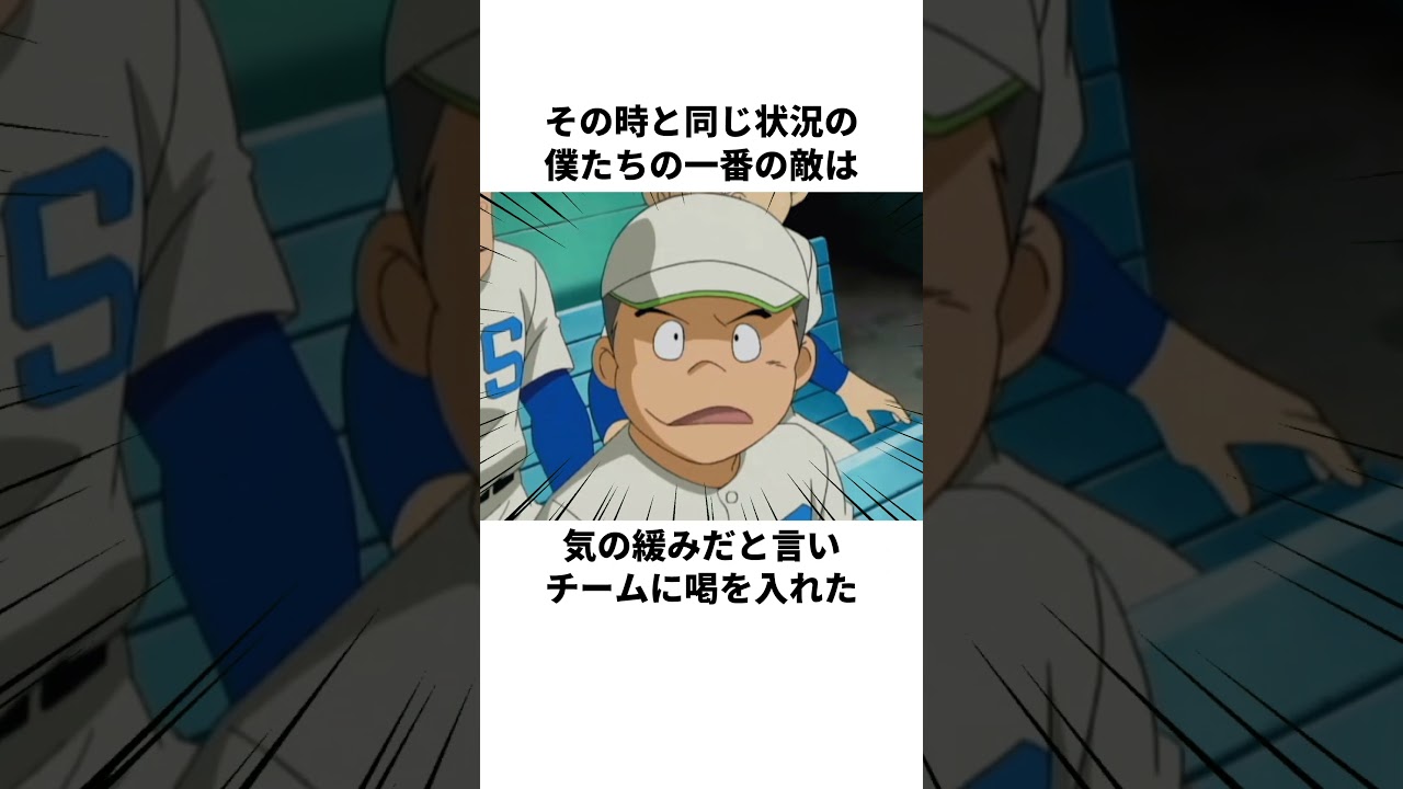 天狗になった先輩に谷口高尾は現実を 突きつけた中山のミスの連発で1点 勝ち越され、3年生たちはたった1点 まぐれで入っただけと思ったが倉橋豊かは 必死に取った一点であの投手で守り切って 勝てると踏んでるといい。山本は 事声ごときに負けるかよとイチ門をつけた が谷口はこのままだと確実に負けます。 負けるわけがないと思っていた共合相手に 1つ1つ必死に点を取ってきた。その時と 同じ状況の僕たちの1番の敵は木の緩みだ と言いチームに勝を入れた。その後き戦は 続き、1点差負けで最終回を迎え、頼み の倉橋も打ち取られてしまったが、1年の 投資も疲れが見え始め1アウト1、3塁で 中山は名誉を挽ろと言われ、やらなくちゃ ならないんだと思いバントに見せかけて バスターで一点し、相手の投手は完全に 崩れてしまい、逆転を許してしまった。 負けて悔しがる姿を見て3年生たちはバカ にしたことを食い、次は強くなってるん だろうなと呟い