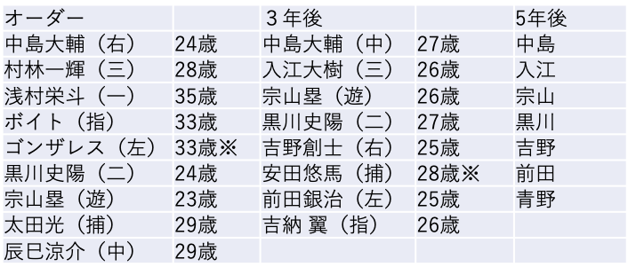 この企画は今シーズンを振り返り、投手・野手と分け、おおよその構成を作っている。投手編は先発ローテーション・中継ぎ・クローザーを設定。野手編は1番から9番までの打順を作っている。もちろん、シーズンは様々起用が変化したから、ここで提示した今季のオーダーが正解というわけではないが、今季の戦いからおおよそのオーダーとして設定している。そして、何よりの肝はそこから3年後、5年後のオーダーを策定。それらを作成した上で、足りないところはどこかを判断し、指名選手を決めていくという流れである。