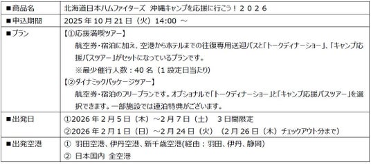 ANA X株式会社(代表取締役社長:神田 真也、本社:東京都中央区、以下「ANA X」)は、10月21日(火)14:00より国内ツアー「北海道日本ハムファイターズ 沖縄キャンプを応援しよう!2026」を発売します。