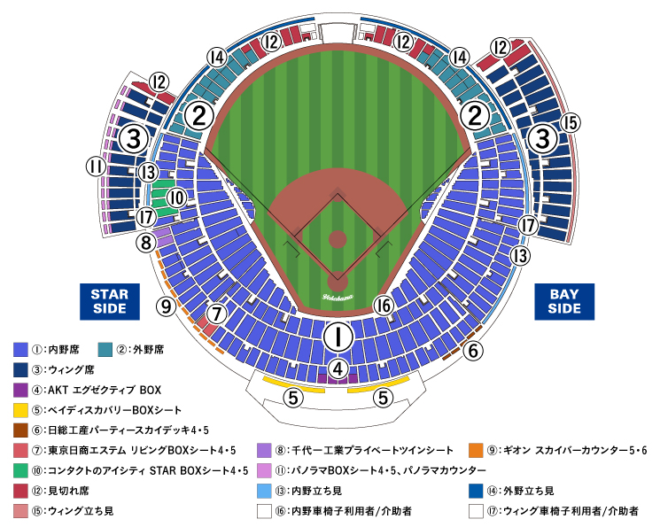 座席位置や塁側はお選びいただけません(「車椅子入場券」のウィング車椅子入場券のみ、BAY SIDEとSTAR SIDEの選択が可能です)