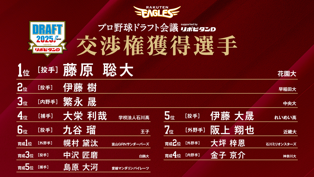 【2025年 プロ野球ドラフト会議 supported by リポビタンD】「契約交渉権獲得」選手のお知らせ – 東北楽天ゴールデンイーグルス 東北楽天ゴールデンイーグルス1位・藤原聡大は「近畿地区大学生No.1投手」2025年ドラフト指名一覧【東北楽天】 パ・リーグ.com【ドラフト会議】上智大学と花園大学から、初のNPB選手誕生へ! 12球団中、9球団が大学生を1位指名(4years.) Yahoo!ニュース伊賀出身の花園大・藤原投手は東北楽天が1位指名 プロ野球ドラフト 伊賀タウン情報 YOU楽天1位の藤原投手、滋賀の県立高出身 「伸びしろある」恩師エール バーチャル高校野球