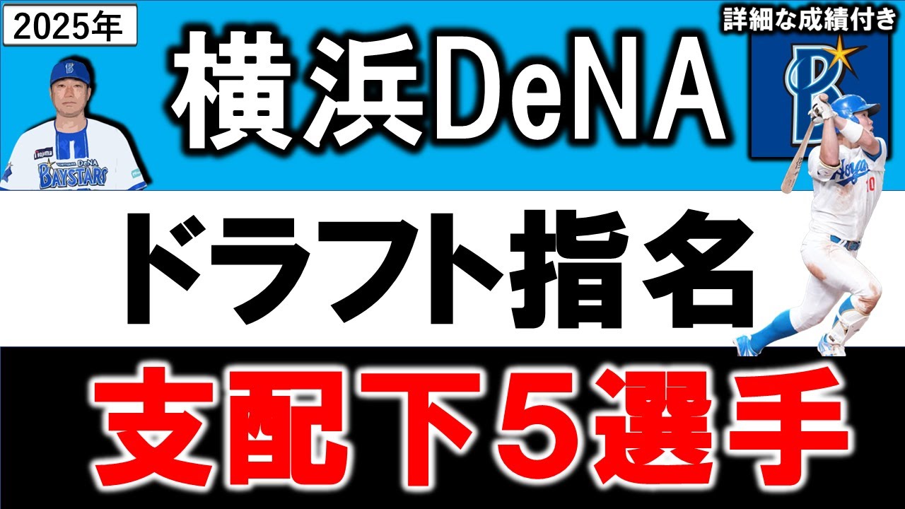 はい、プレボルどマ人です。2025年 DNAドラフト指名選手紹介ということで ございまして、今回のドラフトで指名され た選手、それぞれどういう選手なのか、 どういう成績を残しているのかっていう ところをですね、しっかりと見ていきたい と思います。では早速ですね、一選手から チェックしていきましょう。 はい、ではドラフト1位ですね、見ていき ます。小田高一郎選手青山学院大出身地は 東京都2003年8月15日まで22歳 173cm85kmポジションは ファーストでサードも守る右投げ左打ち 高合さんは34本リーダー大39ホマ 50m6秒に遠頭100m選手タイプは ですね中距離型の選手でございます。はい 。まあ、DNAですね。1試名に関しては 小田選手。ま、ただね、その前に サプライズがありまして、ま、なんと 佐々木り太郎選手を1位指名。ま、ただ 結果ね、ソフトバンクも来ていたので、ま 、そこで富士負けてしまって、ま、織田 選手というただですね、まさかね、佐々木 選手行くとは思っていなかったんで、驚き もありましたし、ま、やってきたなという ところもあったんですけど、ま、そこ外し た後ね、しっかりとこう打戦にし取れ たっていうのは良かったのかなというとこ でございます。で、スカウト評価見ていき ましょう。バットコントロールに超が 備わった大選手に溢れた強打者先球ガにも 立けておりボールを見極め出塁も貢献 できる選手主にファーストを守りがフアが 良くて強さがありポジションにも適正が 感じられる選手とまやっぱね宮崎選手の頭 をねすっていうところもありましたしま 一応こうポジションはファーストではあり ますがサードもねできるんじゃないかって いうところで指名しております。で、成績 見ていくとリーグ戦通算3と一部ですね。 90試合で2割5番2輪、322打数で 81だ。9ホマオペス0.726とま、 小田選手と1部でね、プレイしておりまし て、ま、実は通算で見るとそこまで めちゃくちゃね、打っているわけではない というとこでございます。ま、とはいえね 、打点のリーグではありますし、ま、そこ を考慮したら何もね、低い通字はないと いうことになっております。ま、ちょっと ね、4年秋にあまりこう打っていないと いうか、ま、かなり警戒されているんで、 そこはどうかなっていうところもありつつ ですね、ま、やはりね、しっかりとこう 打ちめされるだけの実力はある選手で ございますんで、こう全然ね、悪くない 使命になっているのかなという風な感じは いたします。まあ、なのでDNAはね、 まずこう課題の内アを埋めてきたっていう ところはありましたし、ま、佐々木選手 行って小田選手っていうね、ま、絶対そこ のポジションを埋めたいというところは 伝わってきましたし、ま、ファンもね、 しっかりとそこは行って欲しいっていう声 もありましたので、ま、納得してる方もね 、多いのかなという風に感じます。はい、 では続いて見ていきましょう。 はい、続いてですね、ドラフト名、島田 春俊也選手東洋台。出身地は神奈川 2003年7月30日まで22歳 185cm95kmポジションピッチャー で右投げ口マックスが155km九州が スライダーカットカーブチェンジアップ などを投げます。はい。ま、DNAね、 ドラフト2で先発ピッチャーを獲得5等ト で活躍するピッチャーでございまして、ま 、非常にね、弾が早く、ま、スタミナも 十分っていうところもありますし、まだ 神奈川出身、地元の選手っていうのも1つ ポイントだったのかもしれません。で、 スカートの評価見ていくと最速155km の本格がピッチャー、スライダー、カーブ 、フォークの精度も高く、伸び代の部分が 多いのも魅力的な将来のエース候補という ことになっております。ま、こう一面もね 、もしかしたらみたいなところもありまし たから、ま、いい選手をこの順位で取れた のかなというところはあれで成績見ていく と一部ですね、今年の春小学者まして、 13試合で6勝4杯、80.2イーニング で防御率2.45、ダサーシ率6.69、 指率3.68と、ま、1部でもまずね、 成績を記録しっかりとこうアピールできて おりました。で、2部では21試で9勝2 敗。93点レイニングで防御率1.06と 。ま、2部でもね、抜群のピッチングを 披労。ま、急速の割にそこまでこう三振が 取れていないってところもあるんですけど 、ま、ただね、その辺はプロで全然改善し ていけるところかなという風に思いますし 、ま、タパもあってね、とにかく休速も出 て請求も破綻していないっていうところを 考えると、ま、面白いピッチャーかなって いうところはありますし、ここ来シーズン ね、ちょっと不安な先発候補っていう ところ、そこをしっかりと確保できている のかなというところあります。コスケット もね、一戦抜けてしまう可能性もありつつ で、大抜き選手も肩の手術を発表。やはり ね、そこも埋めてこないといけないって いうところもありましたから、ま、そう いう意味ではね、適任の選手というところ を2で取れているのかなという感じは 