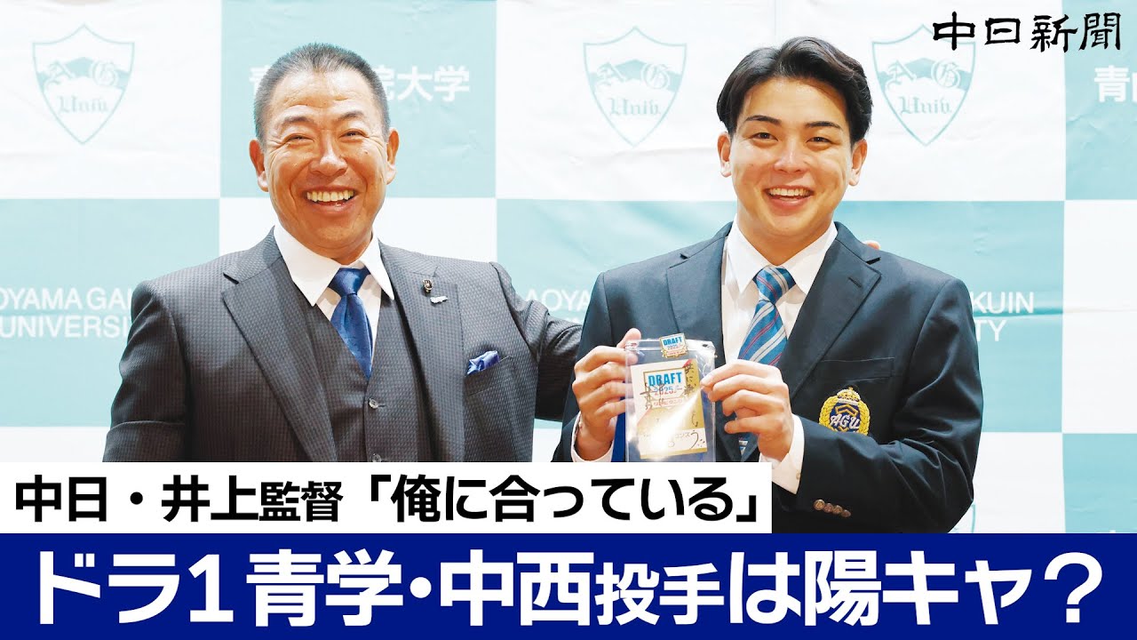 やっちゃう。はい。はい。 [拍手] あの、お2 人、ま、監督と、あの、長、初対面した印象を教えて、初対の印象ってます。 いや、あのね、映像ではよく見てました けど、で、今握手してすごく感じたのが、 ああ、手大きいねと思って、ま、あの、手 が大きいから小さいからというあれでは ないんですけども、確かに長西君は いろんなね、ボールを 操るっていうところを考えた時に、ああ、 なるほどねと思いました。で、ま、対格も ね、あの、すごく素晴らしい対格してます んで、あ、これはもう期待通りだな、期待 できるなっていう風な印象です。 第4、 え、 まあ、今お言葉をいただいて、あの、期待れるように頑張りたいなと思です。中です。 こう改めて中西選手掘れ込んだところを教えていただいてもいいですか? はい。え、先ほども申しましたけどもね、 え、ストレート その他の変化球でゲームを作れ るっていうところがま、あの多分中西区も 、え、校長不調というのはね、1年間通せ ばあったんでしょうけども、その中でも その大崩れをしないというか、ま、今学院 さんはすごくこう優秀な強いチームです からね。その中でやはりイエスとしてこう ずっと投げてきたっていう辺りも、ま、 その彼の、え、なんですかね、経歴、え、 地弁和歌山だったりね、ね、そういった 経歴も見て、あ、なるほど。 そういう厳しい中で、え、期待を込まれて、そして野球をすごく学んできてる選手なんだなっていうところが [音楽] ものすごく僕の中では、あ、選ばしてもらった秘訣一応のポイントですね。はい。 あの、この2007 年から日本一が離れていう中でこう高校大学日本一を経験した党手があの、加わります。 そちらの期待っていうところ教えてですか? いや、もうそういった家を持ってるっていう。そして、まあ、中西区もその準ジドラゴンズっていうチームをなんですか、フォーカスして多分今まで見てきてないと思うんですね。 [音楽] あの、もちろん野球部である以上皆さんその例えば上を目指していくっていう 高校なら、あ、大学なら社会人ならっていう、ま、そのやってる中でもご用を目指している中で で、ま、その東京の強いチームはたくさんいる中でね、え、やってきた、揉まれてきたっていうところはあの、うちのチームにちょっとこう何かプラスになるっていうようなものはすごく期待します。 最後にこう中に選手こうガツポーズとかの企画の投球が印象的な選手ですけども、そういった明るいあの力強いっていうところもドラポジ台にとってはまあなんかね、あのあそこにいるのみんな選手 はい。 駅部の仲間 はい。 あ、そんな怖い顔で見ないでくれ。あの、どんどんあの中西主西君がきっとバンテリンドームに正体ね。 それからいろんなものをこう、え、 サービスしてくれると思うから、あ、そう いった形で、え、ポジティブに、ま、僕は まだ、あ、あったばかりなのでね、監督の 性格っていうのも多分知らないでしょう けども、あの、スカートの情報によります と、1言えば10帰ってくるぐらいの なかなかその要キャラだっていう話も聞い てるんで、あ、じゃあ俺に会ってんのって いう、そういったところはもうどんどん、 え、ま、きっとあの、ぴったり のドラゴンズっていうチームでどういう印象を持ってるか分からないけども、 え、中西君にマッチするチームに入ってくるなという風には思ってます。 ありがとうございます。 続いて質問のある方挙をお願いいたします。 1番後ろの方お願いします。 おお疲れ様です。名石島行きです。 もう早速にはなりますけれども、来シーズン中西に期待する成績どれぐらいでしょう?ま、彼がね、本当にそれは彼に聞くべきではないですか? あの、もちろんローテーションを守る。 佐島さん、あの大学野球っていうのは僕も ちょっと詳しくはないんですけども、ま、 春のリーグとか、ま、夏のとかこう秋野と かね、色々リーグはあるんでしょうけども 、ま、プロの シーズンっていうのは143試合という 長丁場になりますんで、その中で ローゼーションを守るっていうことは、ま 、きっと例えば先発ピッチャーで言えば 25試合から、あ、27、8試合はずっと 守っていたとすればね、それぐらい投げる んですけども、ま、そこはこう生きるねっ ていう風な差しかけで僕もちょっと休ませ たりどんどん行かせたりっていうことはし ていきますがその中で長行けていう風なね 形で家てはい行きますっていうなのが僕の 理想ですしそう将来的になってほしいなっ ていう風に思ってます。 でばもう早速側力として頭から 行って欲しいそんな思いでしょうか。そう ですね。勝負をして欲しい方と、ま、 きっと、え、 中西君以外の野球部のみんなもね、あの、 知ってると思いますけど、例えばうちの ピッチャーで言えば代表といえば高弘 で去年あの金丸夢と辺りをあの同世代って いう形になればね、そういった世代が ガンガンこうヤングドラゴのあ、